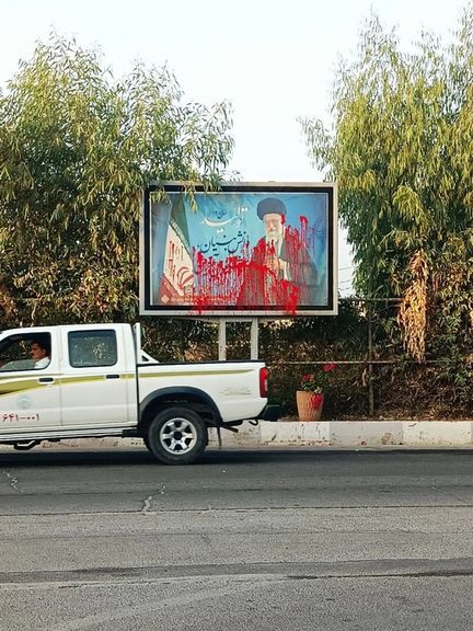 تصویری که یکی از مخاطبان برای ایران اینترنشنال ارسال کرده نشان میدهد در جزیره خارک مردم روی بیلبورد دولتی که عکس علی خامنهای روی آن است رنگ قرمز پاشیدهاند.
