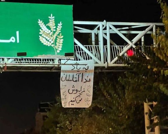 تصویری که در رسانههای اجتماعی منتشرشده نشان میدهد مردم معترض در تهران بنری را به یاد ندا آقاسلطان و کشتهشدگان در اعتراضات سراسری اخیر، از یک پل هوایی در تهران آویزان کردهاند.