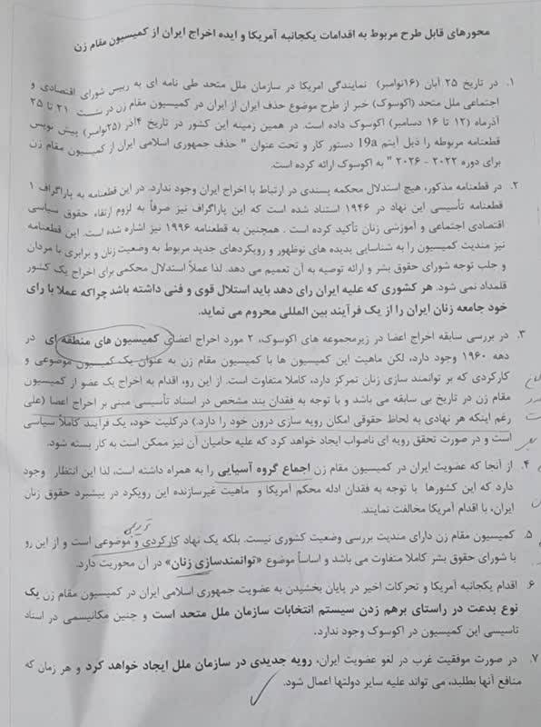 همچنین در متن دیگری با عنوان «محورهای قابل طرح مربوط به اقدامات یکجانبه آمریکا و ایده اخراج ایران از کمیسیون مقام زن» ضمن مرور تلاش آمریکا برای اخراج جمهوری اسلامی از این کمیسیون، تاکید شده است که این اقدام «در تاریخ بیسابقه» است.