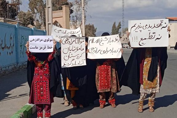 تصویر رسیده به ایران اینترنشنال نشان میدهد شماری از زنان در زاهدان در جریان اعتراضات روز جمعه، پلاکاردهایی در دست گرفتهاند که روی یکی از آنها نوشته شده است: «نه تهدید میپذیریم نه تطمیع»