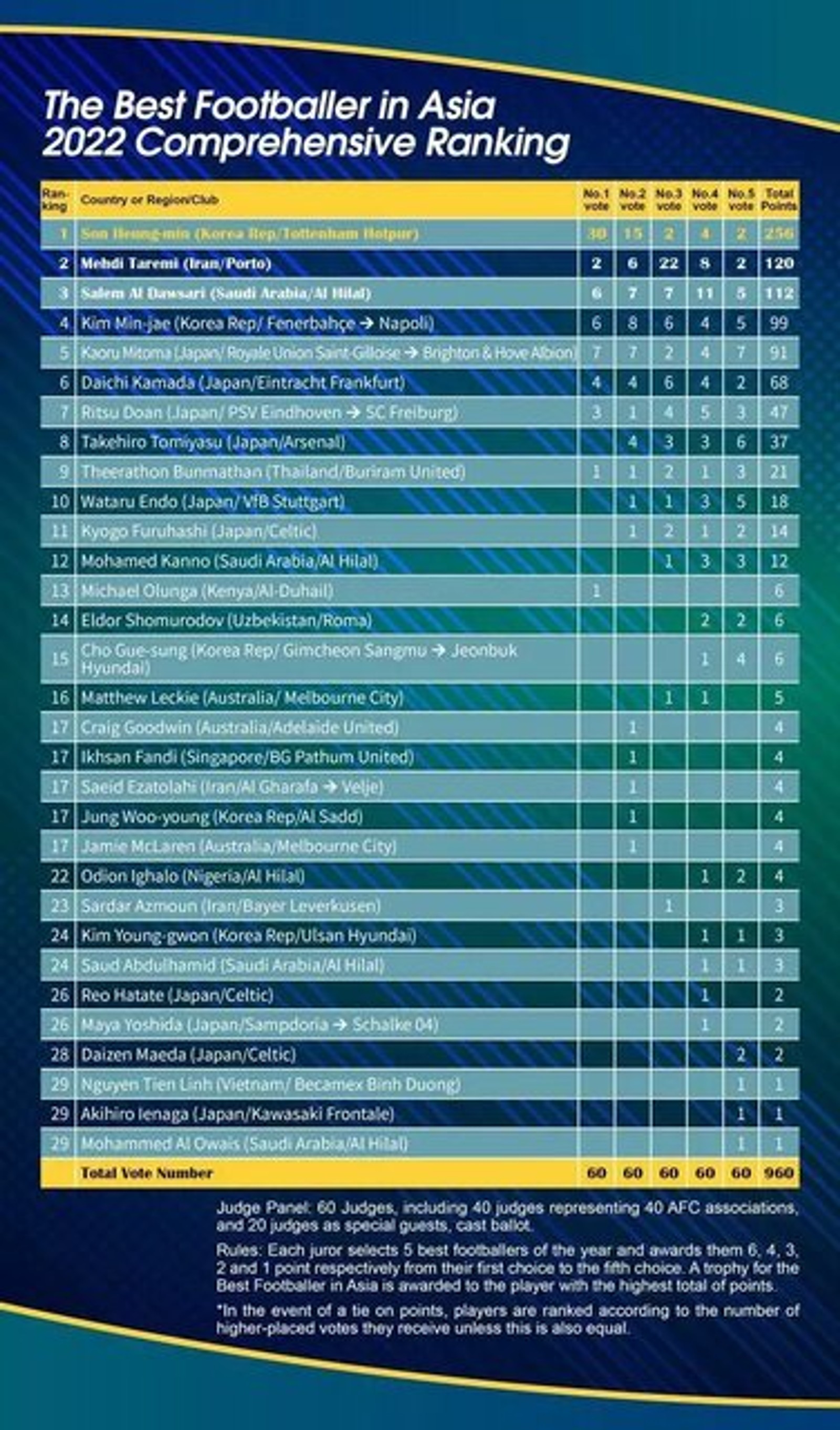 سون هیونگ مین، ستاره کره جنوبی و بازیکن فعلی تاتنهام برای ششمین سال متوالی از سال ۲۰۱۷ به عنوان بهترین بازیکن آسیا انتخاب شد. سون هیونگ مین با کسب ۲۵۶ امتیاز و ۲۶.۷ درصد آرا، بالاتر از مهدی طارمی از ایران با ۱۲۰ امتیاز و سالم الدوساری از عربستان با ۱۱۲ امتیاز قرار گرفت.