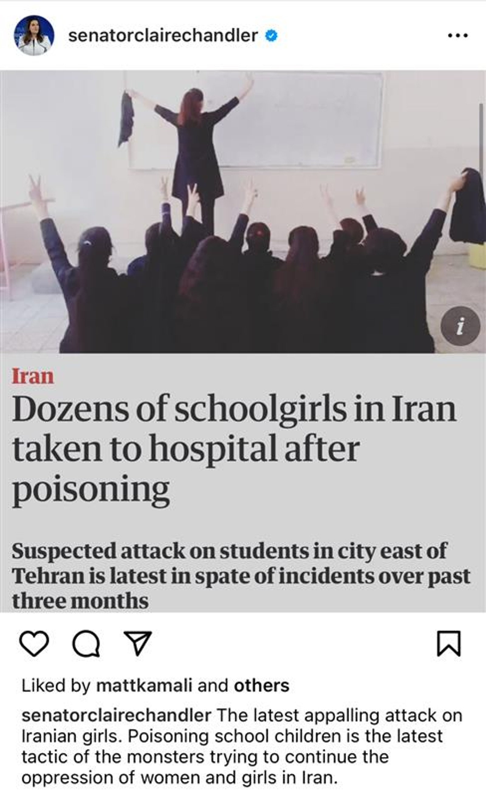 از سوی دیگر، سناتور کلر چندلر، رییس کمیته مراجع امور خارجه، دفاع و تجارت مجلس سنای استرالیا، در حساب اینستاگرام خود نوشت: «حمله وحشتناک دیگر به دختران ایرانی .... مسموم کردن بچه مدرسه‌ای‌ها، جدیدترین تاکتیک هیولاها برای ادامه ستم بر زنان و دختران در ایران است.»