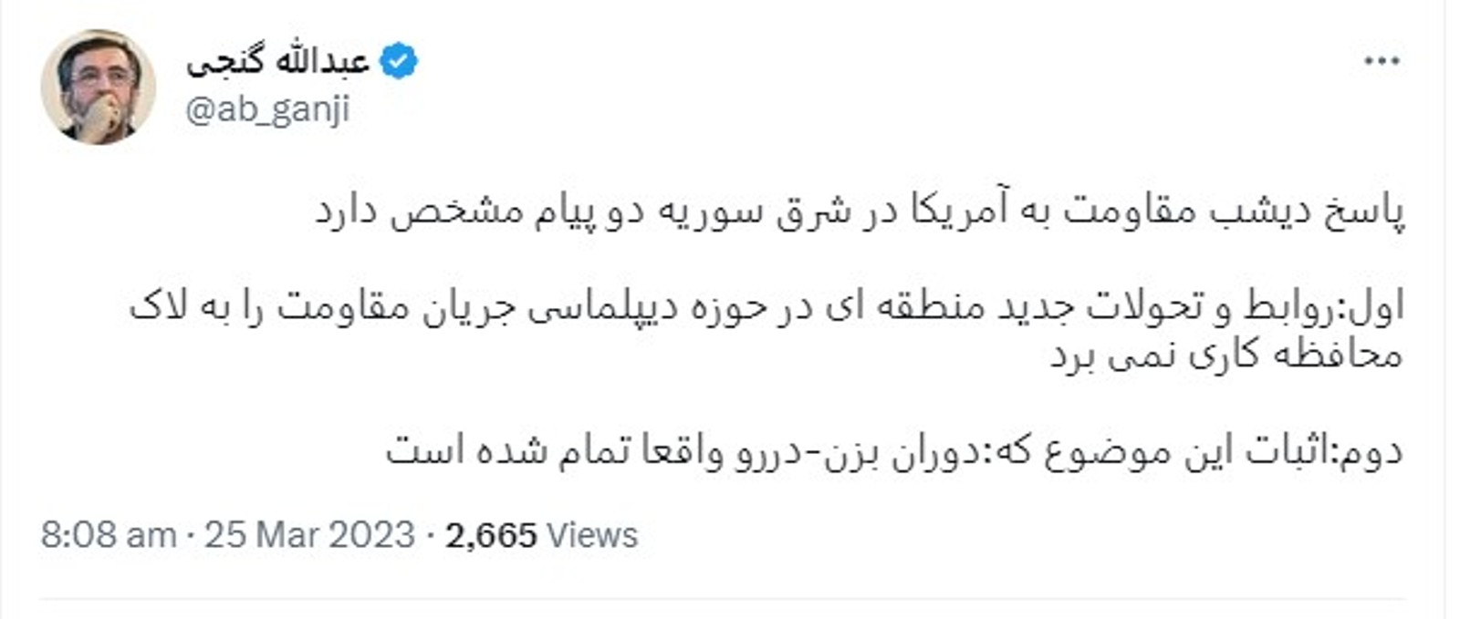 «پاسخ دیشب مقاومت به آمریکا در شرق سوریه دو پیام مشخص دارد. اول: روابط و تحولات جدید منطقه‌ای در حوزه دیپلماسی، جریان مقاومت را به لاک محافظه‌کاری نخواهد برد. دوم: اثبات این موضوع که: دوران بزن-دررو واقعا تمام شده است.»