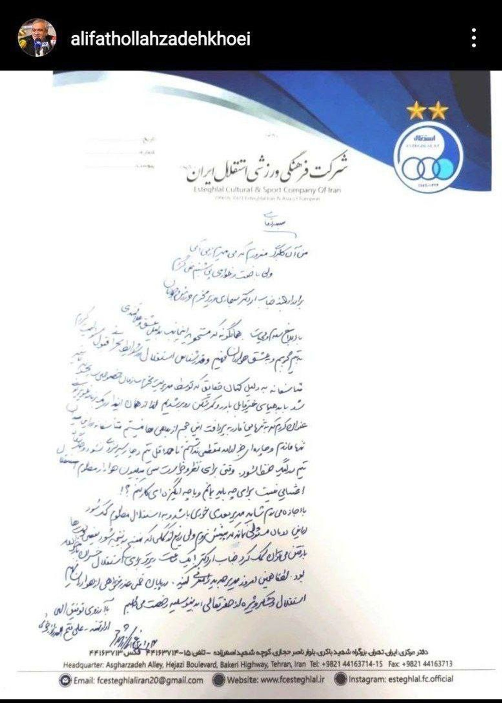 جناب آقای دکتر! یک ساعت دیرتر برای استقلال خسران بار خواهد بود. لطفا همین امروز مدیر جدید را معرفی کنید. در پایان ضمن عذرخواهی از هوادارن فهیم استقلال و تشکر ویژه از حضرتعالی بدین وسیله رخصت می طلبم.»