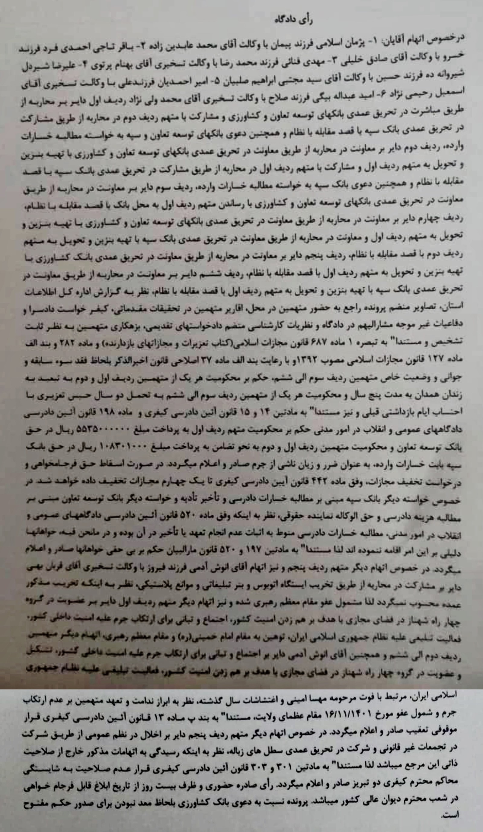 بر اساس حکم صادره، محکومیت این افراد که در زندان تبریز به‌سر می‌برند، بابت اتهام «محاربه» از طریق تحریق عمدی بانک‌های توسعه تعاون، کشاورزی و سپه با قصد مقابله با نظام جمهوری اسلامی در جریان اعتراضات سال گذشته است.