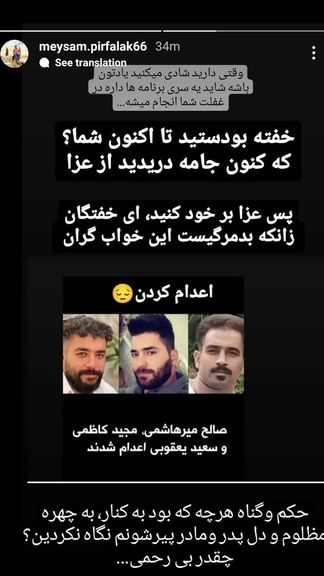 میثم پیرفلک، پدر کیان، کودک کشته شده در اعتراضات ایذه هم در استوری اینستاگرام خود با انتشار تصویر این سه جوان اعدام شده و با اشاره به همزمانی آن با قهرمانی تیم پرسپولیس در لیگ برتر فوتبال ایران، نوشت: «وقتی دارید شادی میکنید یادتون باشه شاید یه سری برنامهها داره در غفلت شما انجام میشه ....»
