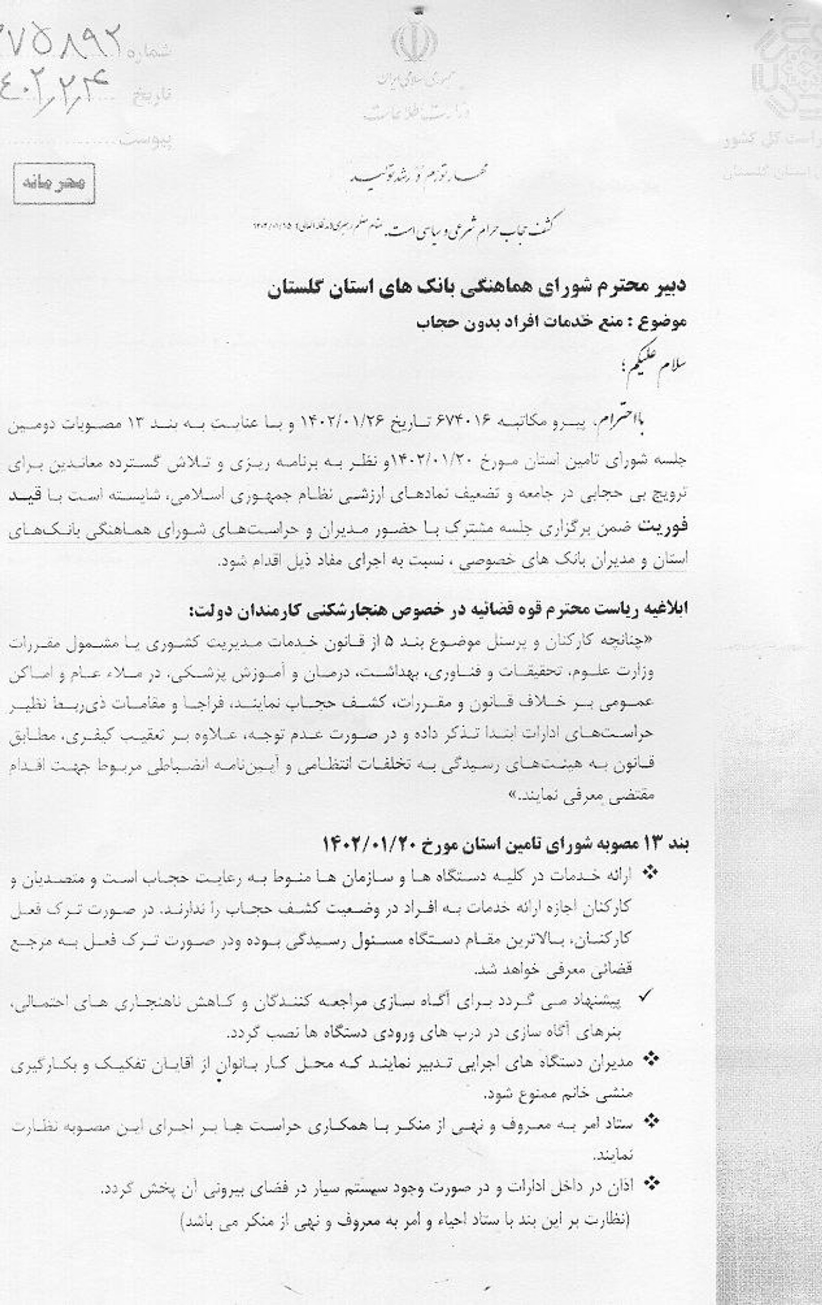 در این نامه آمده که چند روز قبل از آن، در ششم اردیبهشت، کمیسیون هماهنگی بانک‌ها، جلسه‌ای را برای عدم ارائه خدمات بانکی به زنان بدون حجاب اجباری برگزار کرده و مصوبات آن جلسه، اکنون باید اجرا شود.