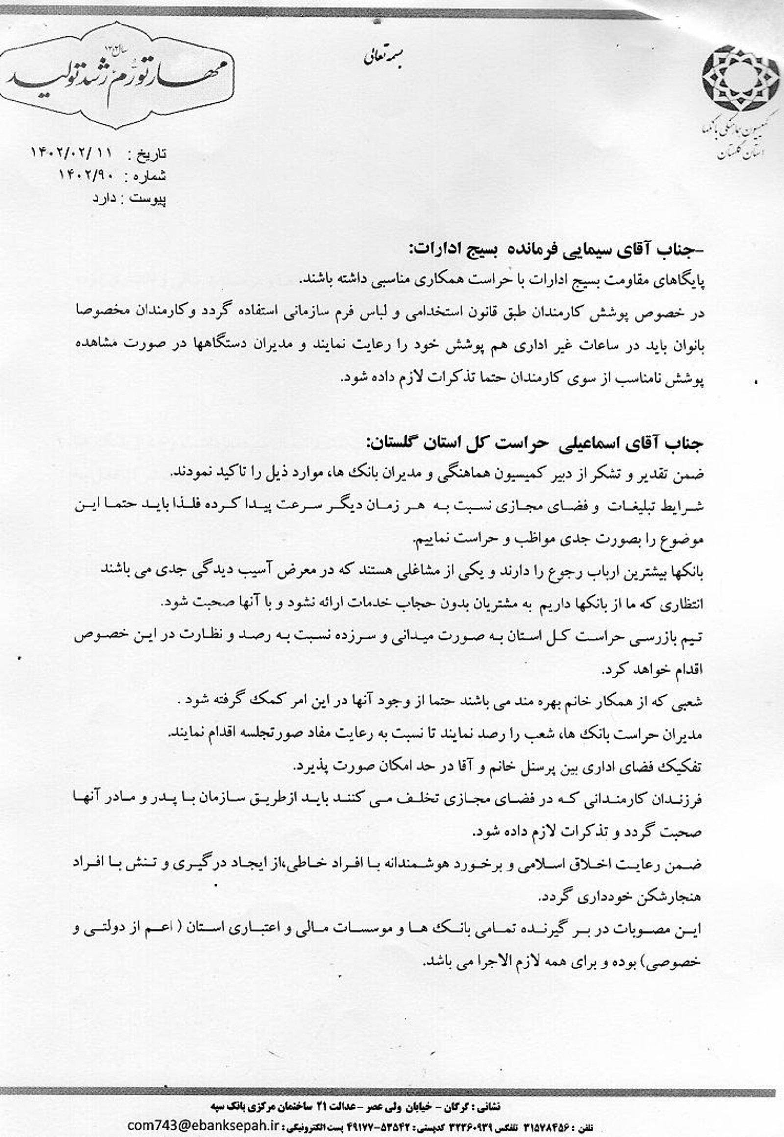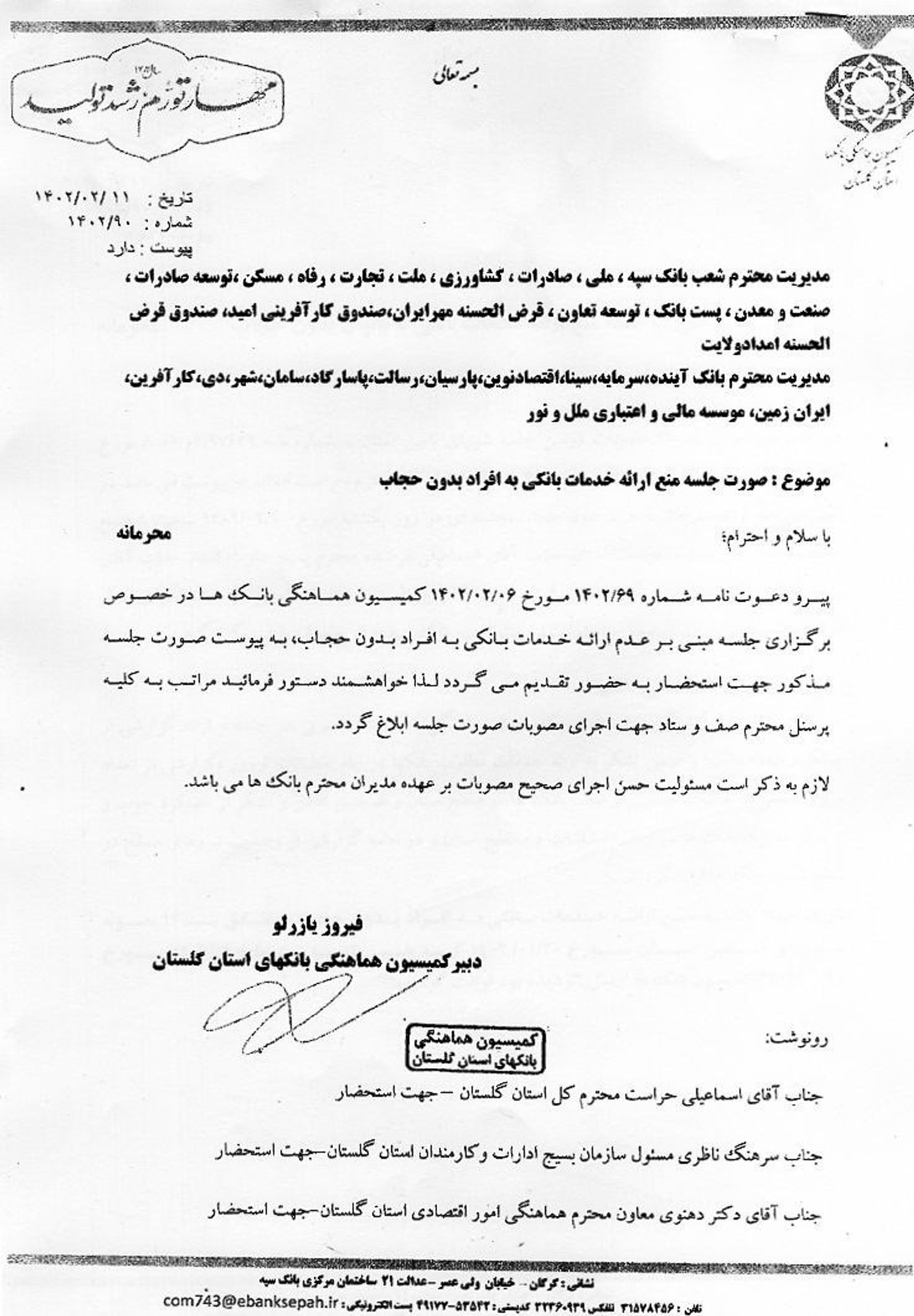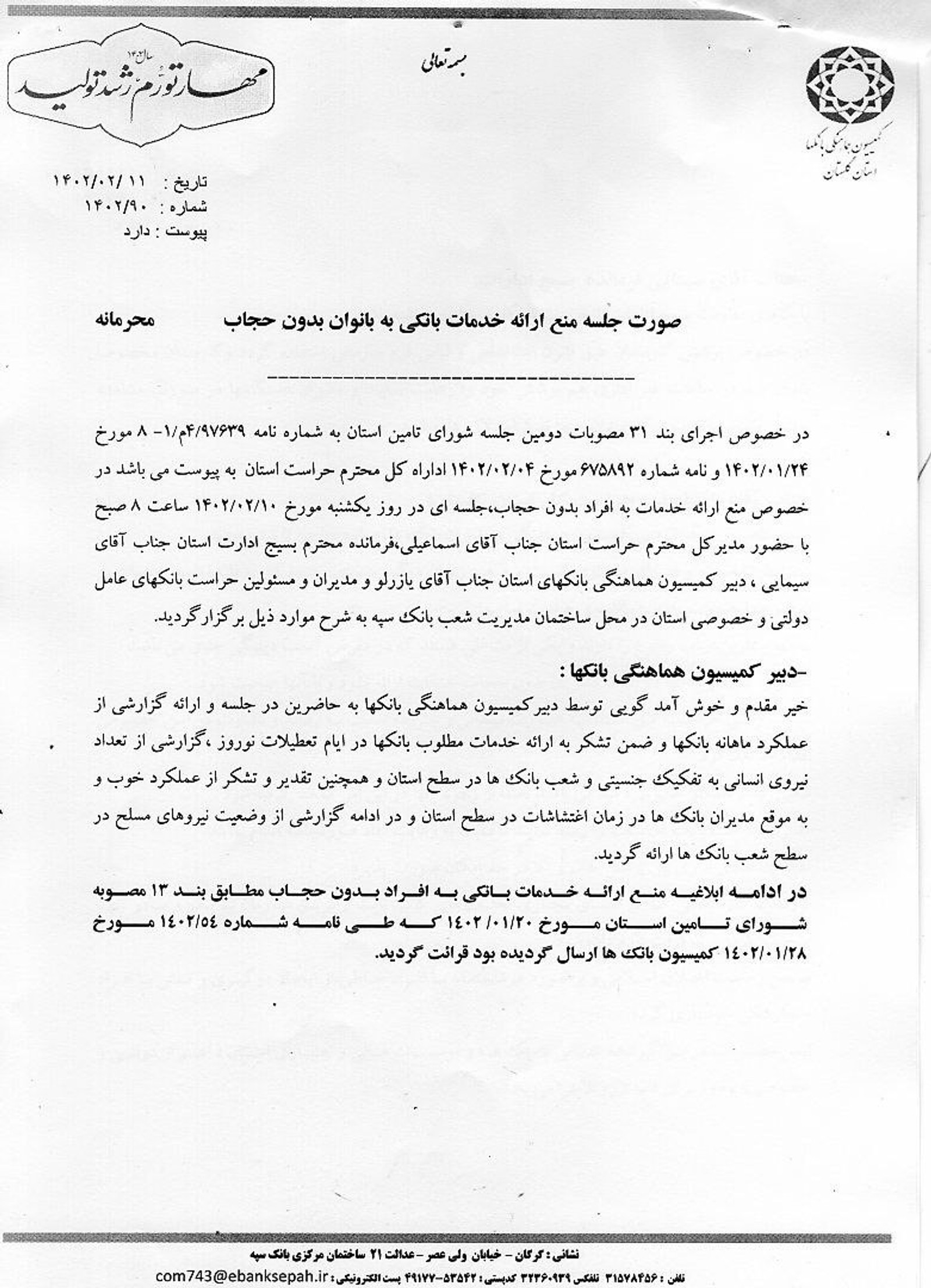 در مصوبات کمیسیون هماهنگی بانک‌های استان گلستان آمده: «تفکیک فضای اداری بین پرسنل خانم و آقا در حد امکان صورت پذیرد.»