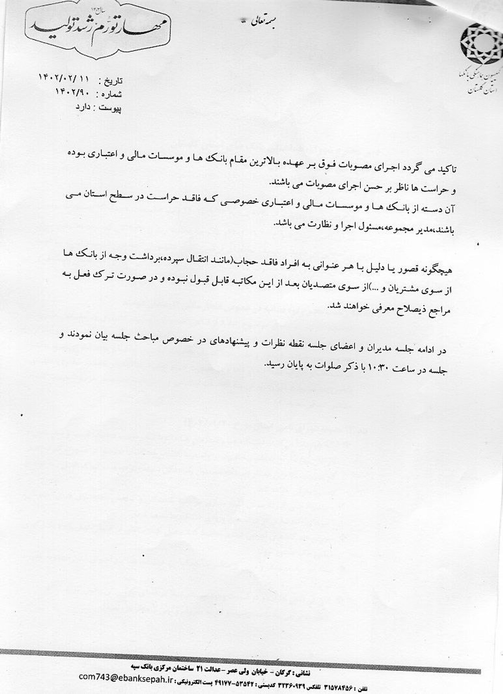 در صورت‌جلسه‌ای که به ضمیمه این نامه است، تاکید شده که «هیچ‌گونه قصور یا دلیل با هر عنوانی به افراد فاقد حجاب (مانند انتقال سپرده، برداشت وجه از بانک‌ها از سوی مشتریان و ...) از سوی متصدیان بعد از این مکاتبه قابل قبول نبوده و در صورت ترک فعل به مراجع ذیصلاح معرفی خواهند شد.»