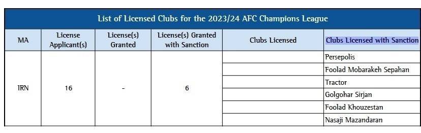 کنفدراسیون فوتبال آسیا امروز بهصورت رسمی اسامی باشگاههایی را که با دریافت مجوز حرفهای فصل ۲۴-۲۰۲۳ در لیگ قهرمانان آسیا حضور خواهند داشت، اعلام کرد؛ پرسپولیس، سپاهان و نساجی. علاوه بر این گلگهر، فولاد خوزستان و تراکتور هم مجوز حرفهای گرفتهاند. نام استقلال در این لیست نیست.