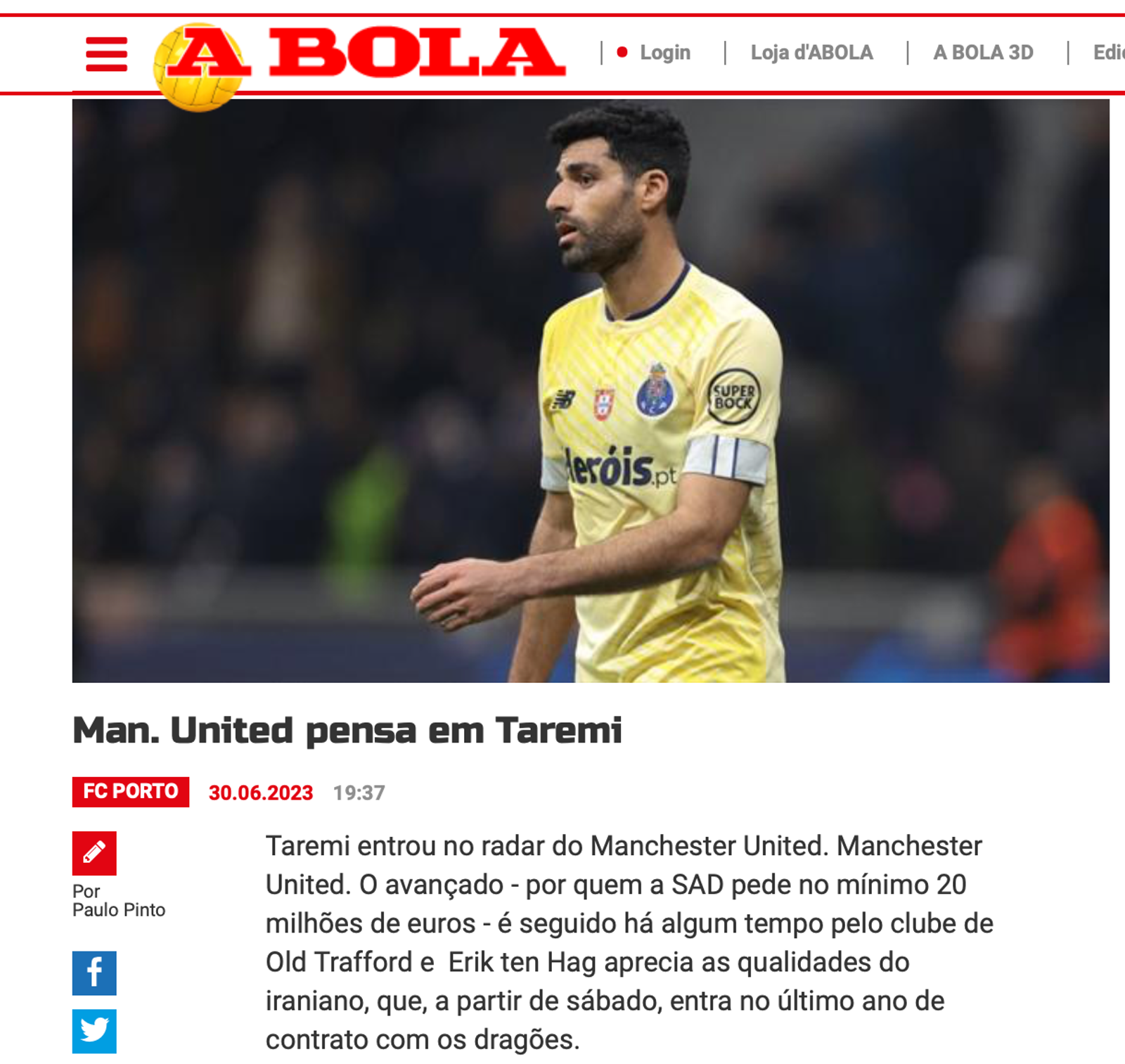 ابولا، یکی از روزنامه‌های ورزشی پرتغال نوشت: «مهدی طارمی که باشگاه پورتو برای او حداقل ۲۰ میلیون یورو می‌خواهد، مدتی است که توسط باشگاه اولدترافورد دنبال می‌شود و اریک تن هاگ به نوع بازی این بازیکن ایرانی که از شنبه (امروز) وارد آخرین سال قراردادش با پورتو می‌شود، علاقه دارد.»