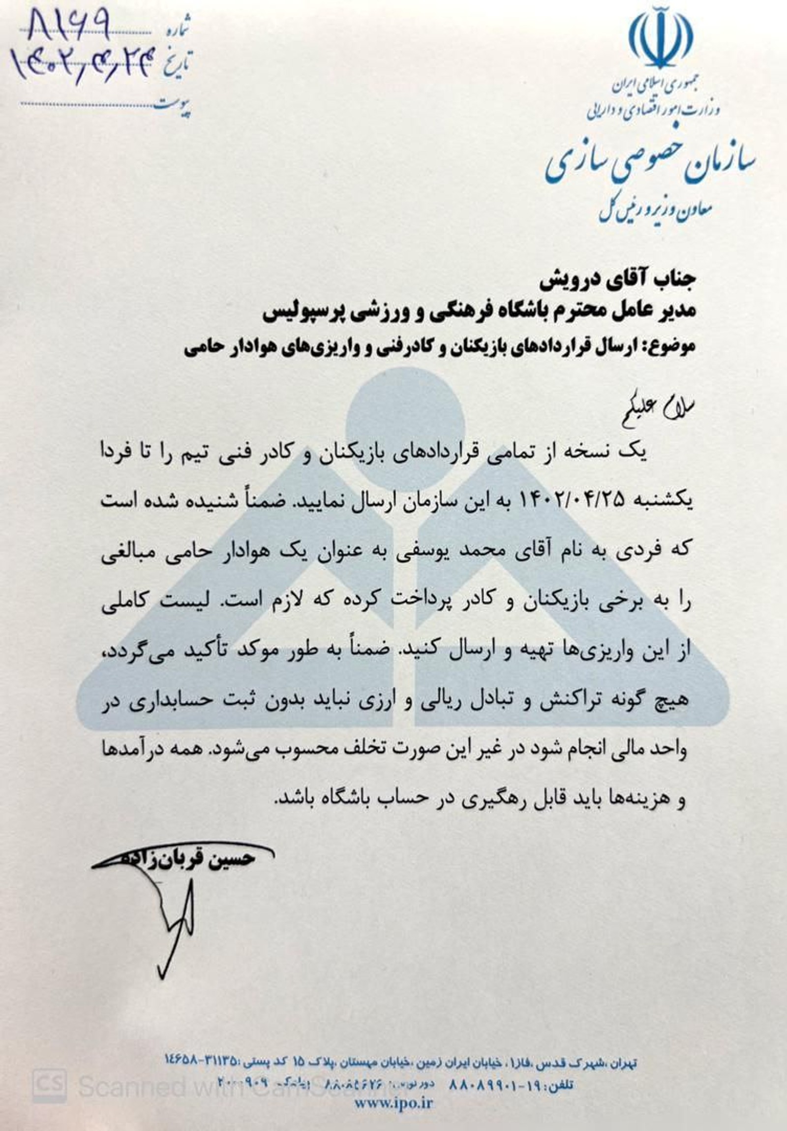 در نامهای که عصر دیروز از طرف قربانزاده به مدیرعامل پرسپولیس نوشته شده و رسانههای ایران منتشر کردهاند، آمده است: «یک نسخه از تمامی قراردادهای بازیکنان و کادر فنی تیم را تا فردا یکشنبه ۱۴۰۲/۰۴/۲۵ به این سازمان ارسال نمایید ضمناً شنیده شده است که فردی به نام آقای محمد یوسفی به عنوان یک هوادار حامی مبالغی را به برخی بازیکنان و کادر پرداخت کرده که لازم است لیست کاملی از این واریزی ها تهیه و ارسال کنید ضمناً به طور موکد تأکید میگردد، هیچ گونه تراکنش و تبادل ریالی و ارزی نباید بدون ثبت حسابداری در واحد مالی انجام شود در غیر این صورت تخلف محسوب میشود. همه درآمدها و هزینه ها باید قابل رهگیری در حساب باشگاه باشد.»