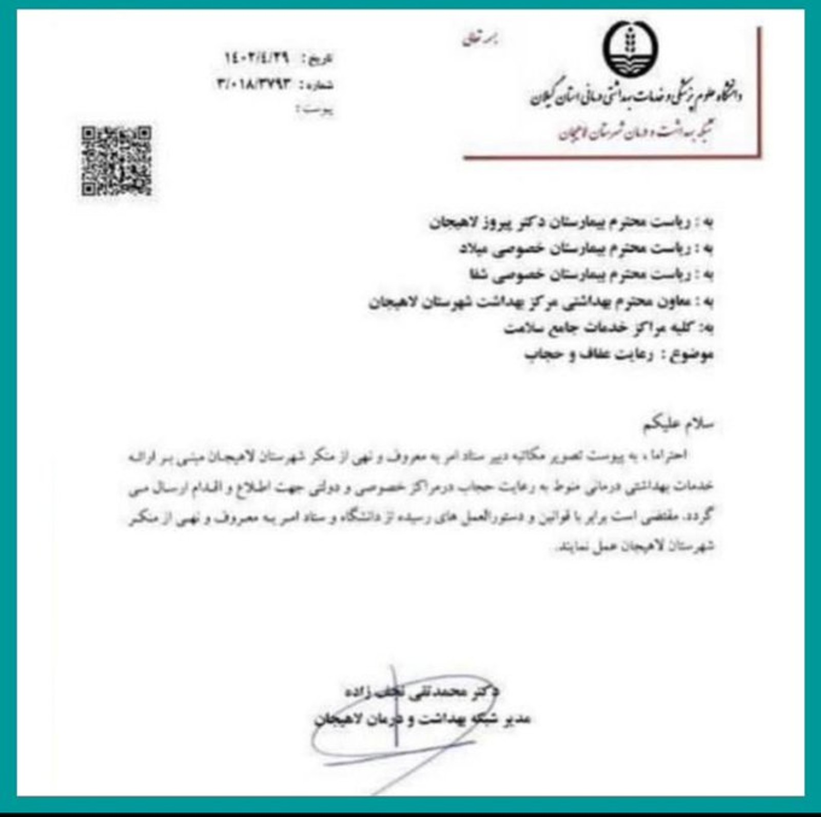 این نامه به امضای محمدتقی نجف‌زاده، مدیر شبکه بهداشت و درمان شهر لاهیجان رسیده و در آن آمده است که با توجه به مکاتبه دبیر ستاد امر به معروف و نهی از منکر لاهیجان، «ارائه خدمات درمانی منوط به رعایت حجاب در مراکز خصوصی و دولتی است».