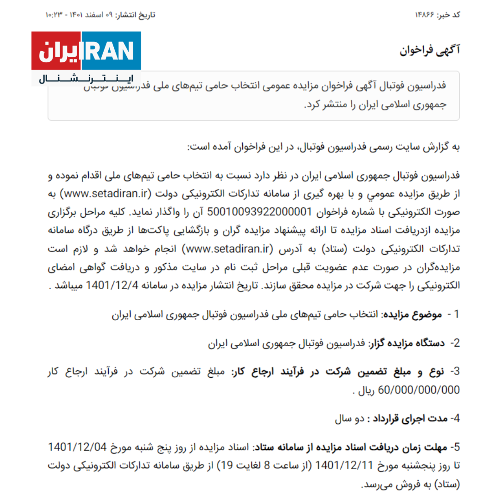 این در حالی است که سایت رسمی فدراسیون فوتبال در هنگام اعلام شرایط حضور در مزایده، مبلغ تضمین شرکت در فرآیند ارجاع کار را ۶ میلیارد تومان اعلام کرده بود.