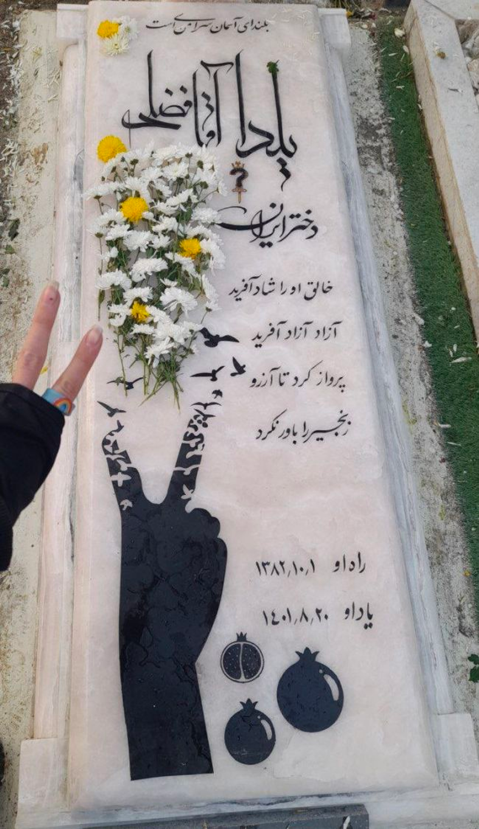 قبر یلدا آقافضلی دیگر کشته اعتراضات تاکنون پنج بار تخریب شده است. او معترض ۱۹ سالهای بود که روز چهارم آبان با خشونت شدید نیروهای امنیتی در خیابان انقلاب دستگیر شد، درباره نحوه دستگیریاش گفته بود: «چهل مامور به سمتش حمله کردهاند، یکی از آنها نزدیک بوده او را با موتور زیر بگیرد. بعد او را روی زمین کشیدهاند و چنان دستهایش را با دستبند بستهاند که رگهایش را حس نمیکرد.» او در ۱۵ آبان از زندان قرچک آزاد شد و در پیامی صوتی به دوستانش گفت که با وجود فشارهای بازجویانش، هرگز ابراز پشیمانی نکرده. او گفته بود که در زمان بازداشتش در زندان به شدت مورد ضرب و شتم شدید قرار گرفته است. یلدا هنگام آزادی از زندان و در اغلب ویدیوها و عکسهایش هفت پیروزی را نشان میداد. پنج روز پس از آزادی، یک شب خوابیده و بیدار نشده است. روی سنگ قبرش هفت پیروزی را حک کرده بودند. هفتی که سه بار توسط نیروهای امنیتی پاک شد و بعد به تخریب صورتش اقدام کردند. پدرش در واکنش به تخریبها گفت این حقارت آنها و بزرگی یلدا را نشان میدهد. بر روی سنگ قبرش نوشتهاند: «هیچ وقت زنجیر را باور نکرد.»