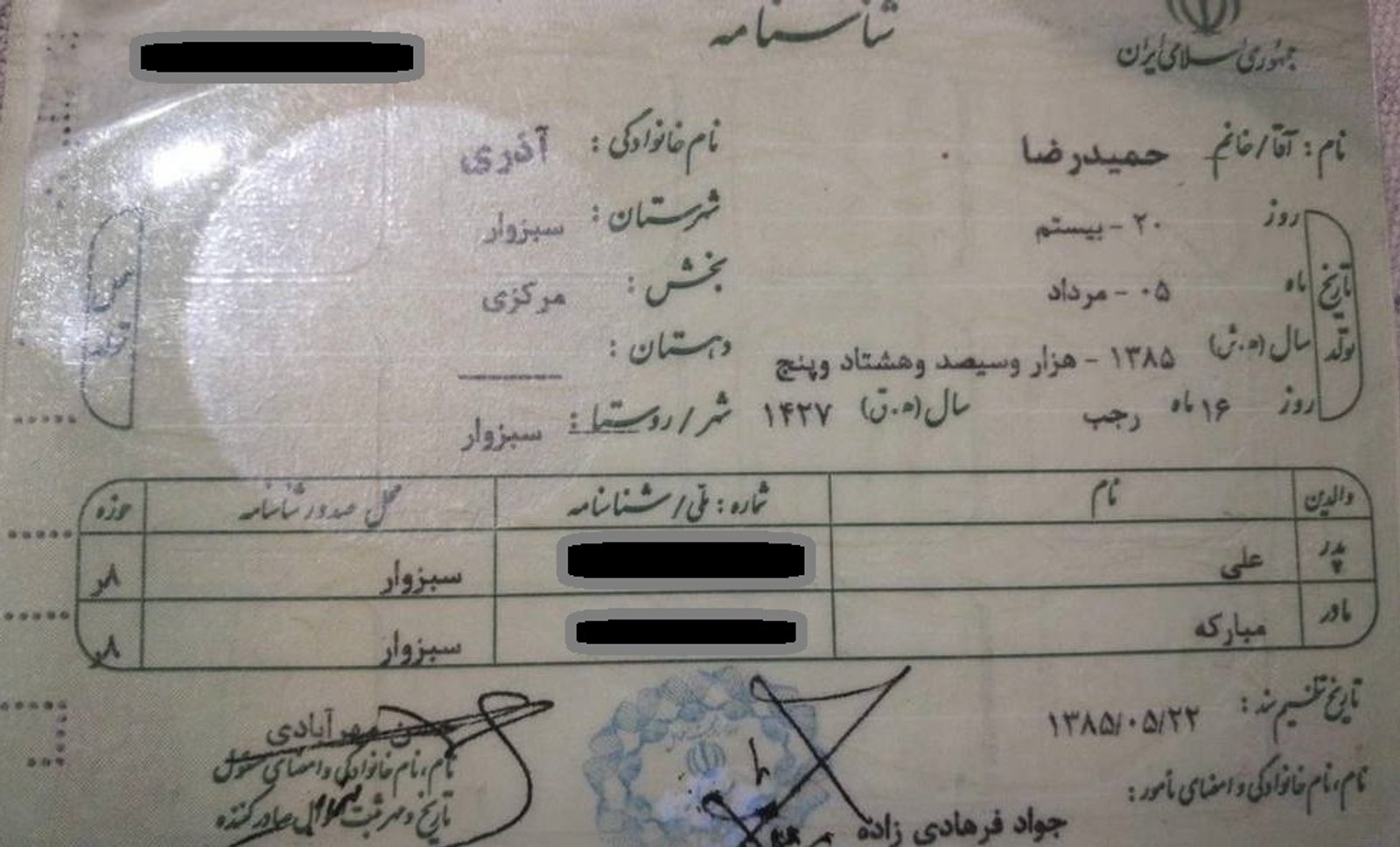 تصویر شناسنامه حمیدرضا آذری، کودک_مجرم اعدام شده