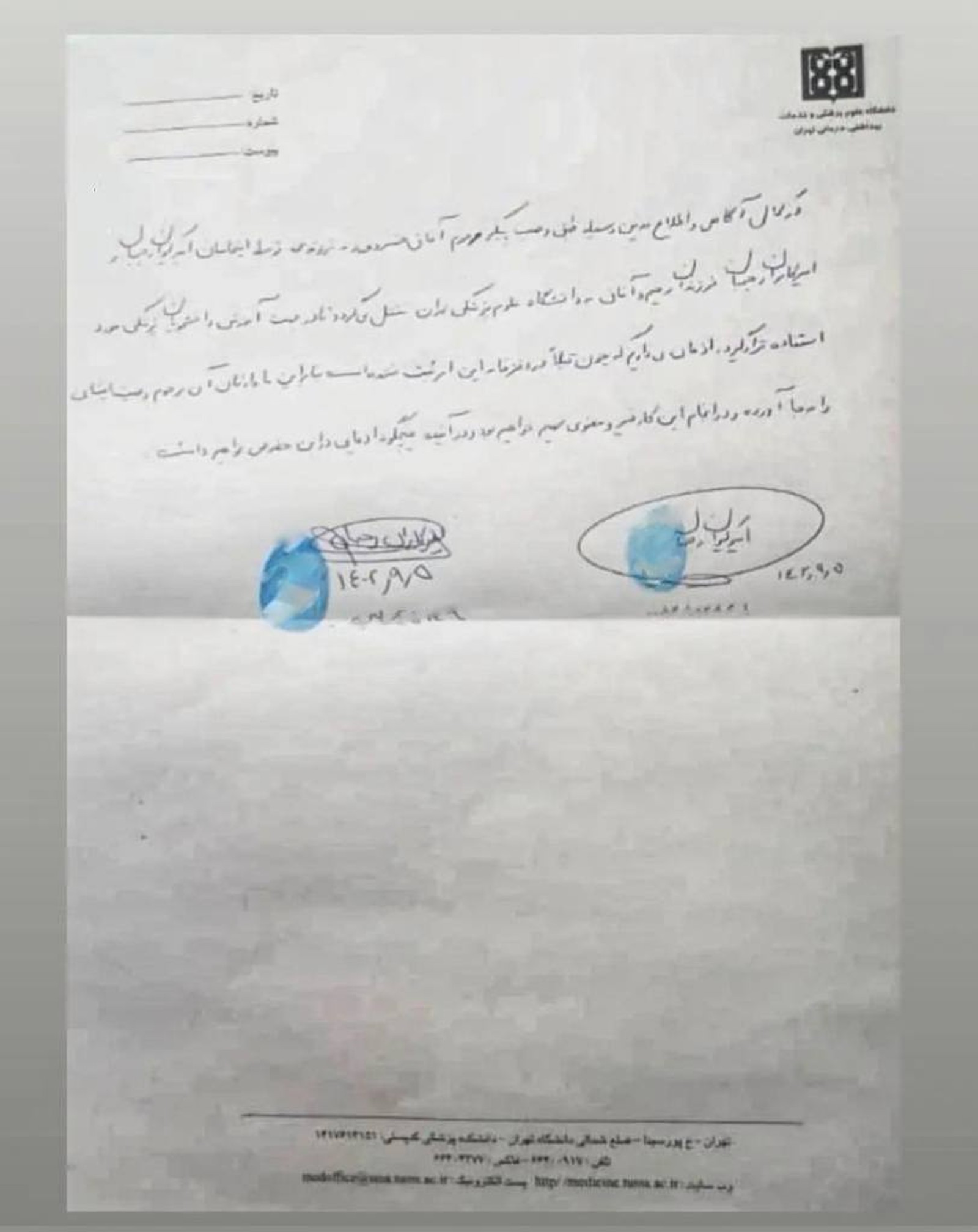 تصویر نامه اهدای پیکر «آفاق خسروی زند» به دانشگاه علوم پزشکی تهران