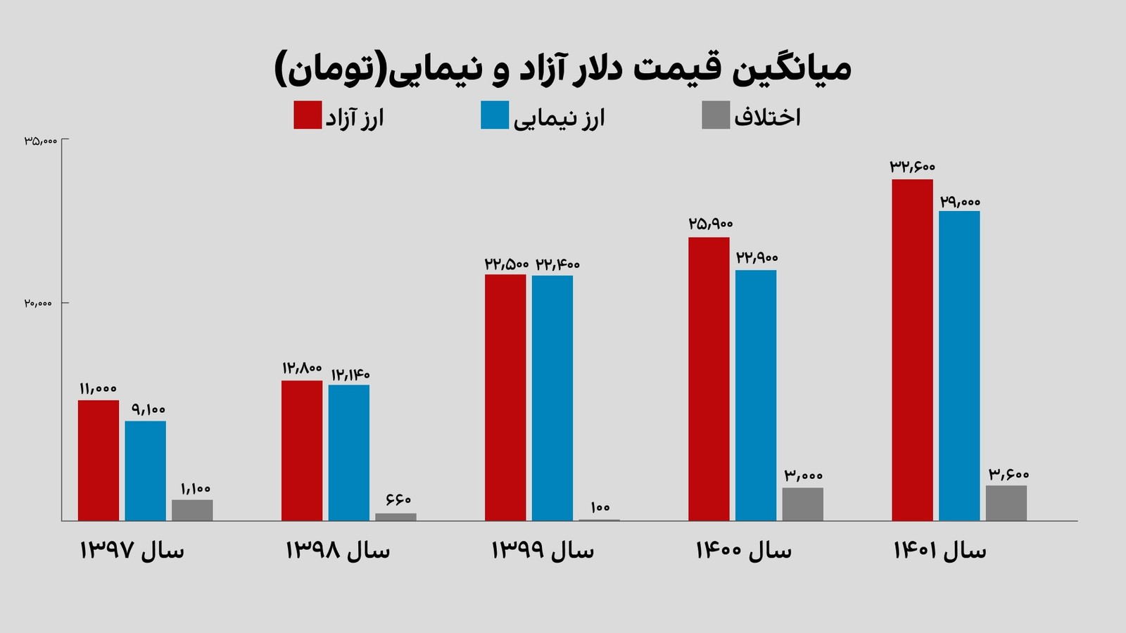 قاعدتا دریافت‌کننده ارز نیمایی قیمت آن را به ریال پرداخت کرده است. رانت موجود اختلاف قیمت دلار در بازار آزاد و دلار نیمایی است. طی سال ۱۳۹۷ تا پایان سال ۱۴۰۱ به طور میانگین اختلاف دلار نیمایی و آزاد حدود هزار و ۸۰۰ تومان بوده است. در دو میلیارد دلار، این رانت حدود سه هزار و ۷۰۴ میلیارد تومان، چیزی حدود ۷۴ میلیون دلار است که فاصله بسیاری با دو میلیارد دلار دارد.
