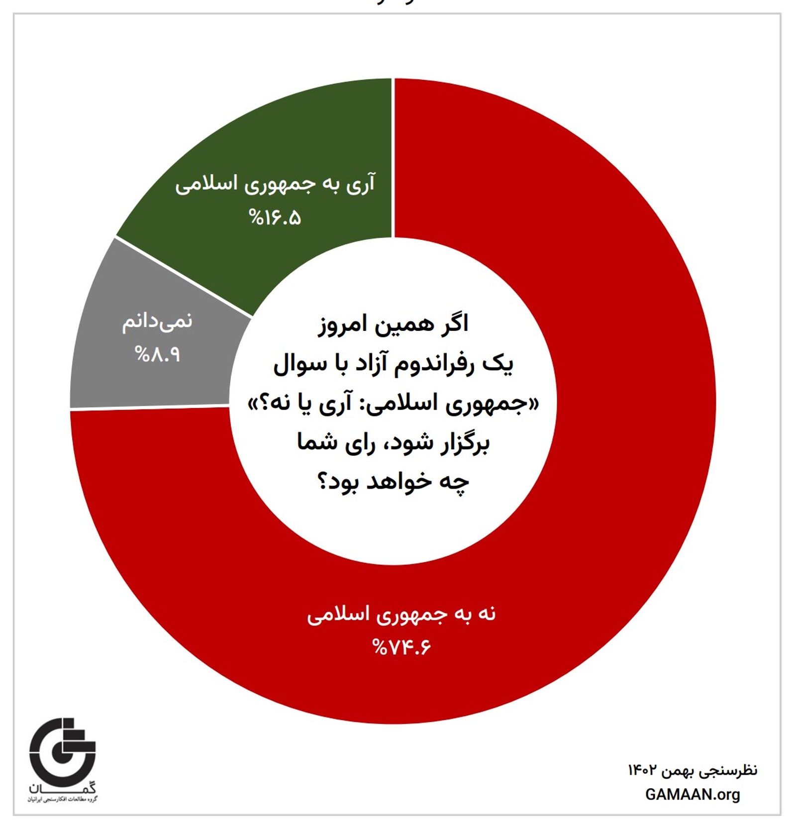 در پاسخ به این پرسش که «اگر همین امروز یک رفراندوم آزاد با سوال "جمهوری اسلامی: آری یا نه؟" برگزار شود، رای شما چه خواهد بود؟» حدود ۷۵ درصد پاسخ‌دهندگان «نه به جمهوری اسلامی» و ۱۶ درصد «آری به جمهوری اسلامی» را انتخاب کردند.