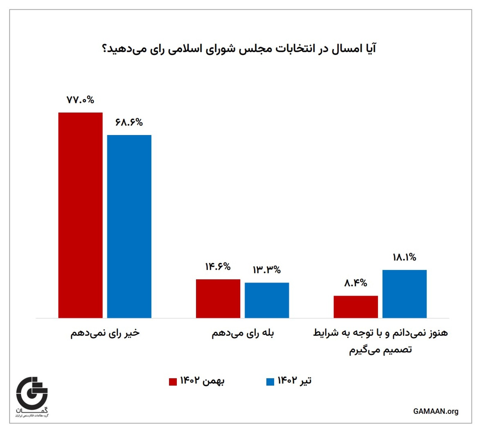 نتایج نظرسنجی «نگرش ایرانیان به انتخابات ۱۴۰۲» که از سوی گروه مطالعات افکارسنجی ایرانیان (گمان) مستقر در هلند انجام شده، نشان می‌دهد که ۷۷ درصد شرکت‌کنندگان در این نظرسنجی اعلام کرده‌اند در انتخابات رای نمی‌دهند.