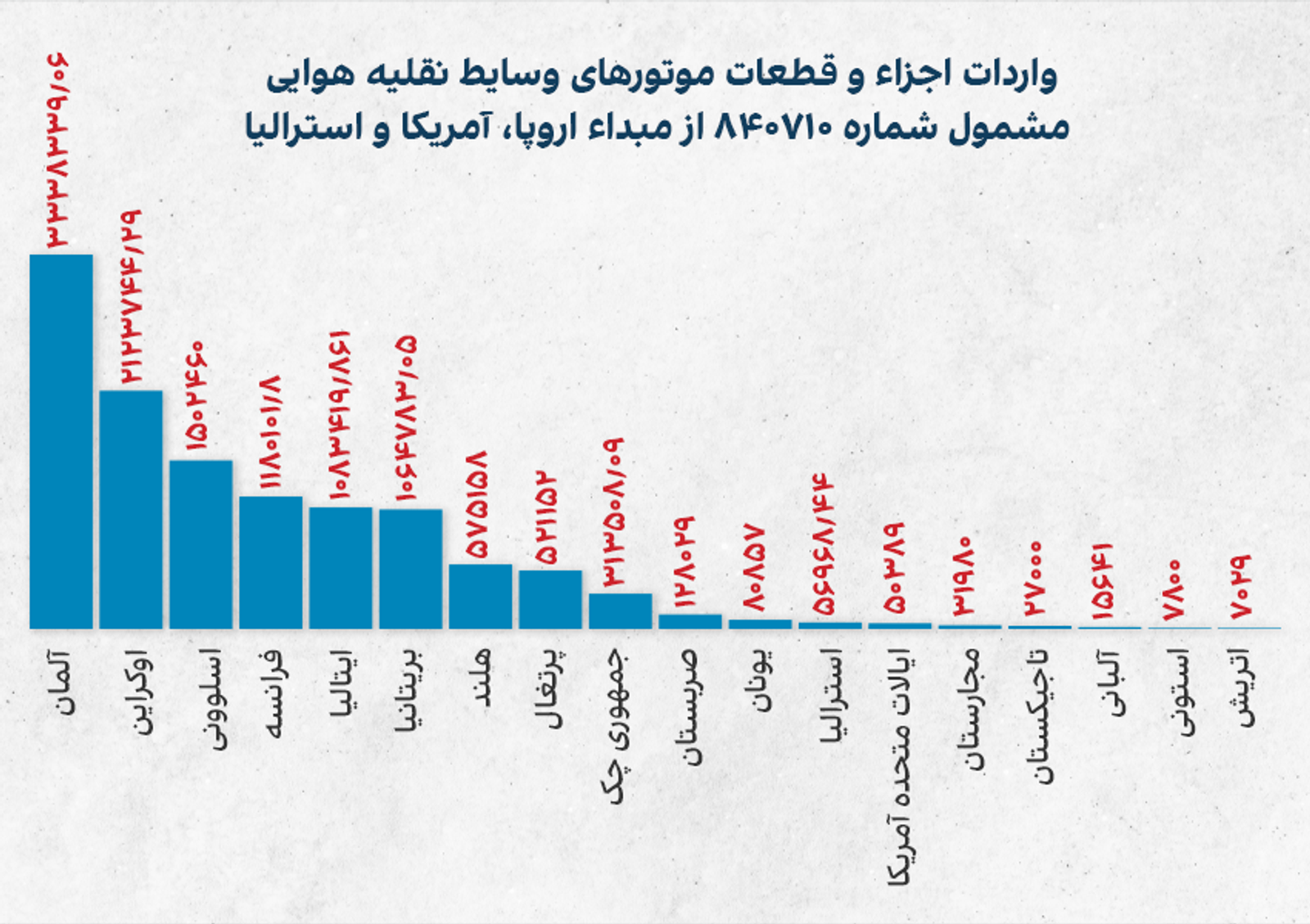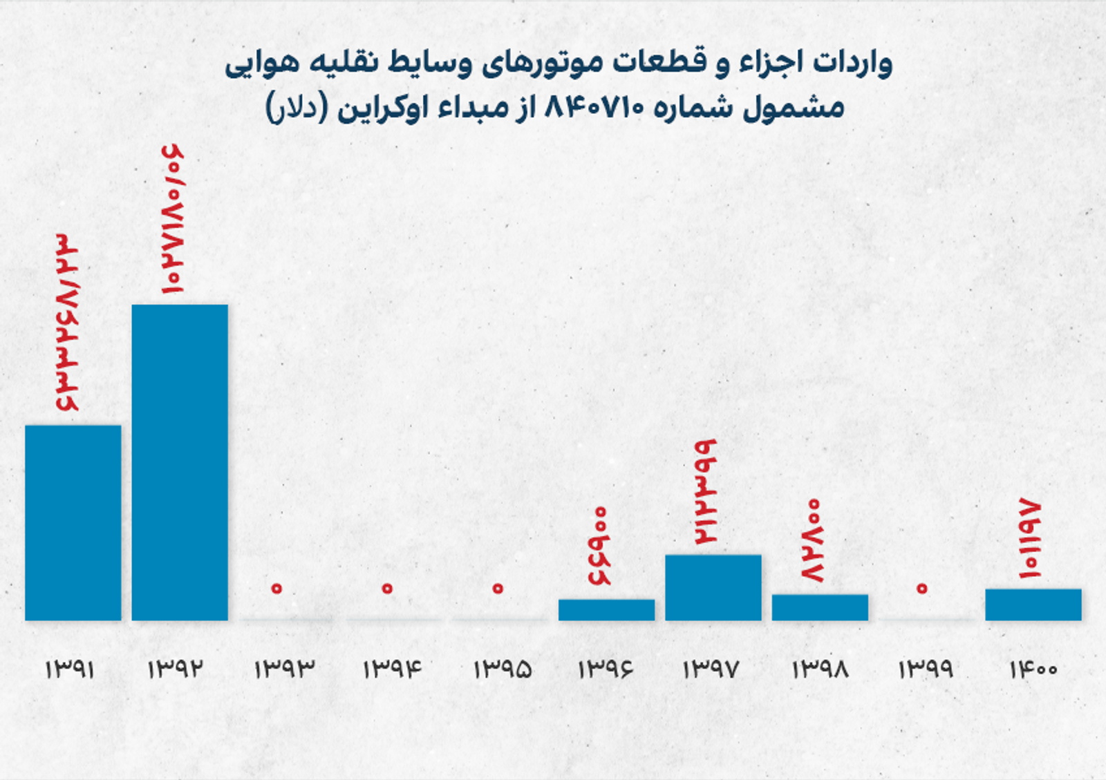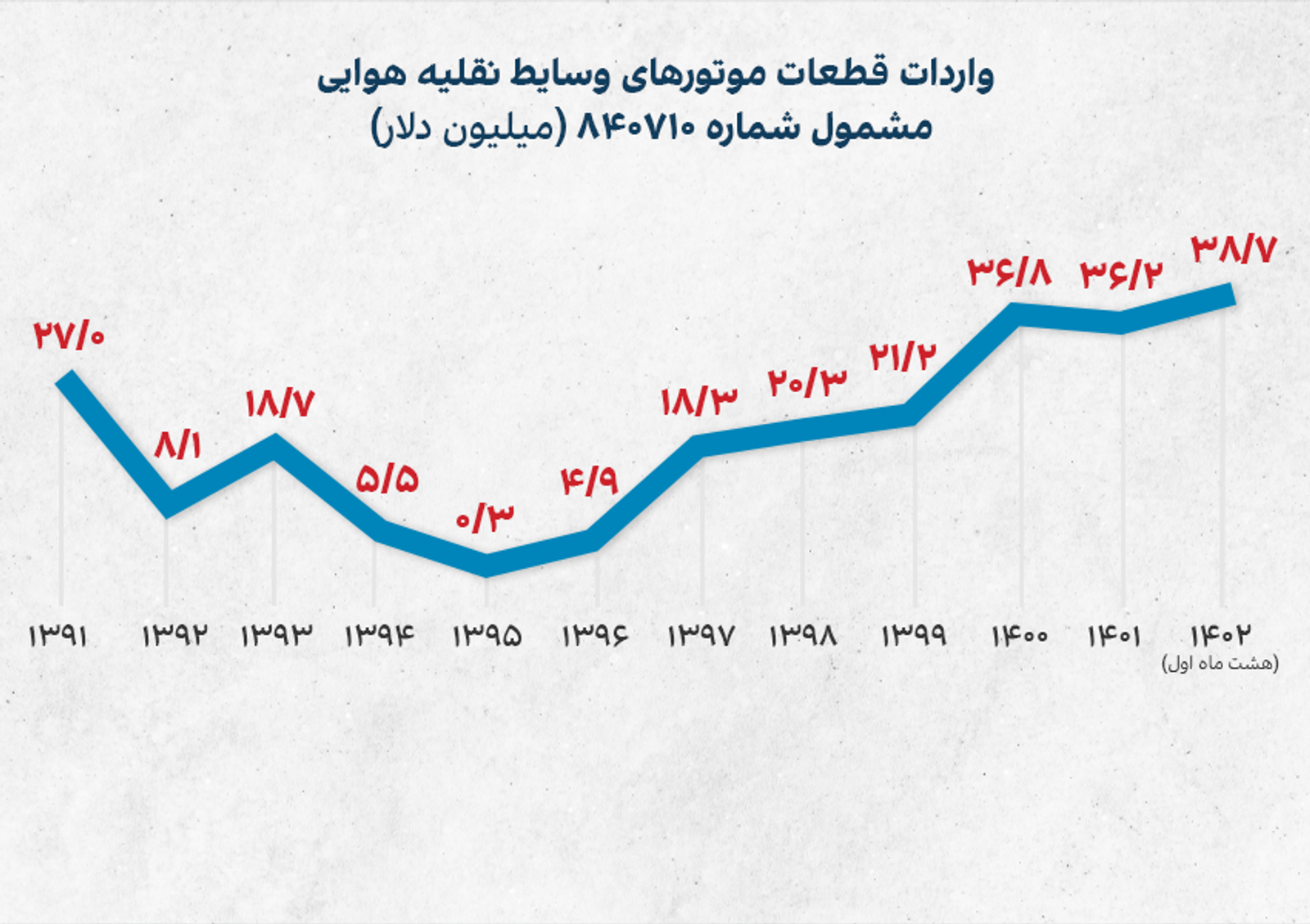 کد تعرفه ۸۴۰۷۱۰ مربوط به «اجزاء و قطعات موتو‌رهای وسايط نقليه هوایی» است. آمار گمرک جمهوری اسلامی نشان می‌دهد از سال ۱۳۹۱ تا هشت ماه اول امسال، مجموعا ۲۳۶ میلیون دلار از این کالا به کشور وارد شده است. واردات این محصول در سال ۱۳۹۵ به کمترین حد خود یعنی حدود ۳۰۰ هزار دلار رسیده بوده، اما پس از آن رشد چشم‌گیری داشته است.