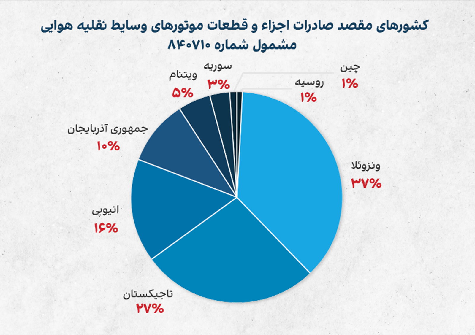 اولین مقصد صادرات قطعات موتورهای وسایل نقلیه هوایی در این مدت ونزوئلا بوده است. حدود ۲۰ میلیون دلار از این تجهیزات به ونزوئلا صادر شده که معادل حدودا ۳۷ درصد کل صادرات این ردیف است. پس از آن تاجیکستان با حدود ۱۴/۴ و اتیوپی با حدود ۸/۶ میلیون دلار قرار دارند.