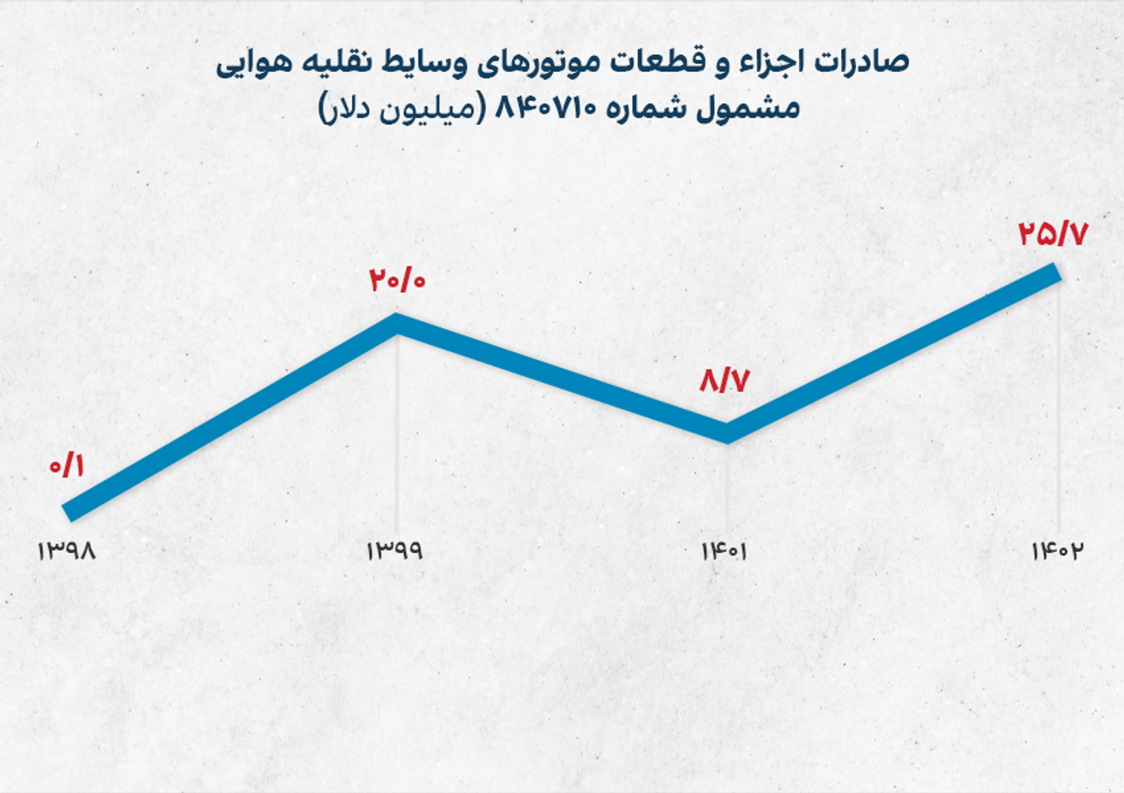 از طرف دیگر جمهوری اسلامی که خود، وارد کننده این تجهیزات تا سال ۱۴۰۰ بوده،‌ ناگهان به صادرکننده این کد تعرفه تبدیل شده است. صادرات اجزاء و قطعات موتورهای وسایط نقلیه هوایی، از تقریبا صفر در سال ۱۳۹۹، به حدود ۲۶ میلیون دلار در هشت ماه اول سال ۱۴۰۲ رسیده است.