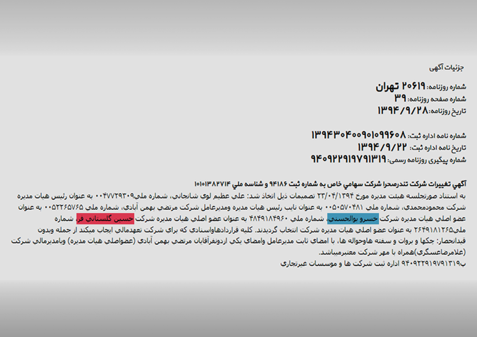 این شرکت که تیرماه سال ۱۳۸۹ تاسیس شده، در تاریخ تیر ۱۳۹۴، هیات مدیره‌اش را اینطور معرفی کرده: علی عظیم لوی شانجانی به عنوان رییس هیات مدیره، محمود محمدی به عنوان نایب رییس هیات مدیره، مرتضی بهمن‌آبادی، خسرو بوالحسنی و حسین گلستانی‌فر به عنوان اعضای هیات مدیره.