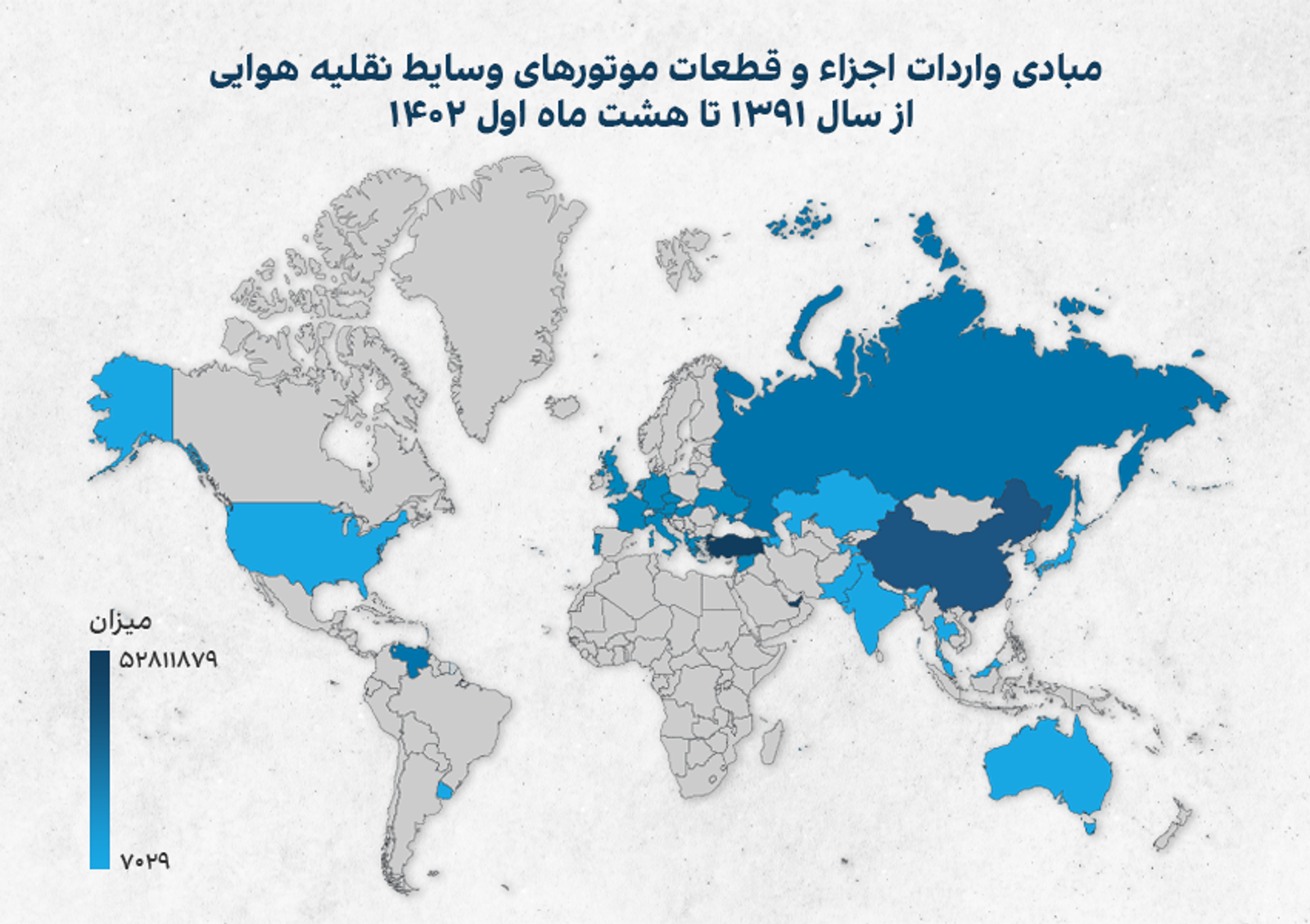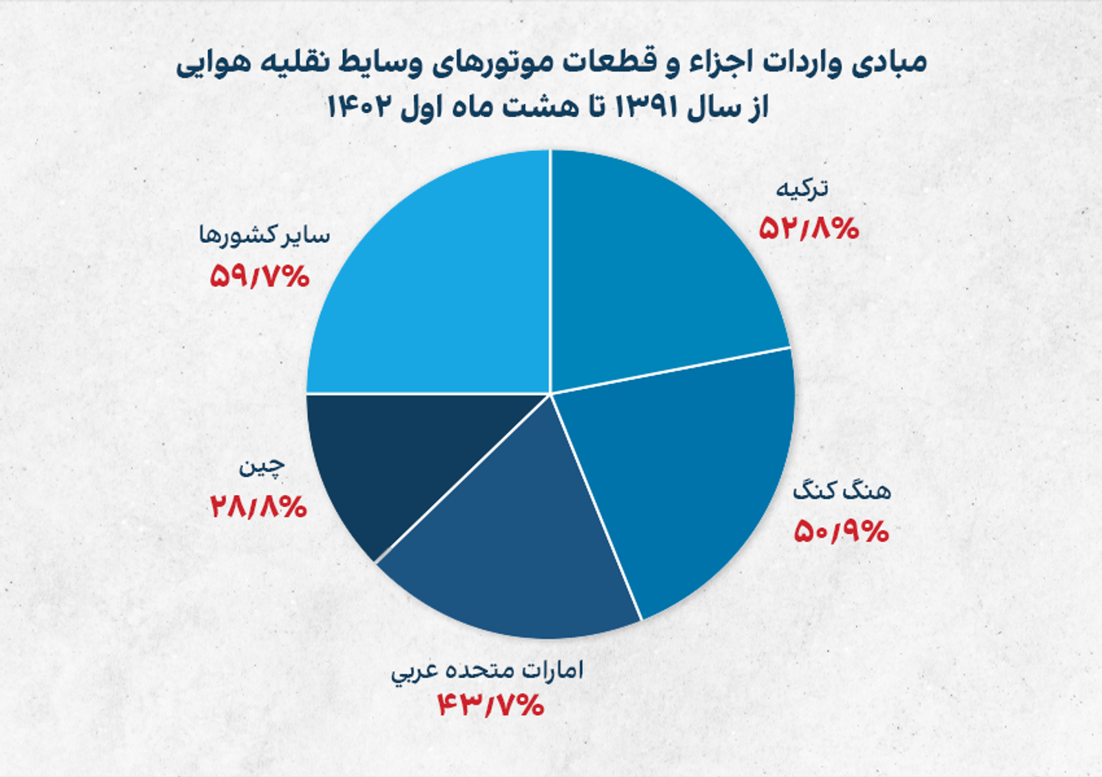 مبداء ۷۵ درصد کل واردات اجزاء و قطعات موتورهای وسايط نقليه هوایی از سال ۱۳۹۱ تا هشت ماه اول ۱۴۰۲، ترکیه، هنگ‌کنگ، امارات متحده عربی و چین بودند.