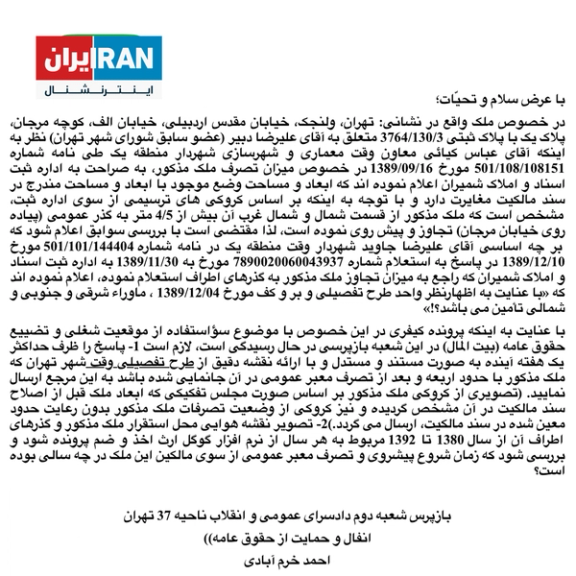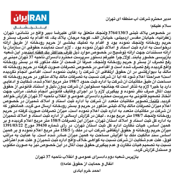 در ادامه نامه آمده: «لیکن در گزارش ارسالی از اداره ثبت اسناد و املاک شمیران به اداره کل ثبت اسناد و املاک استان تهران، میزان این تصرفات ۱۵۸/۵ متر مربع اعلام گردیده و بر همین اساس، هیأت نظارت اداره کل ثبت استان تهران، در رأی شماره ۳۹۴۳۰ مورخ ۱۳۹۱/۰۳/۲۲ میزان حریم رودخانه و حقوق ارتفاقی شرکت آب در ملک را ۱۵۸/۵ متر مربع اعلام نموده و بر همین اساس سند مالکیت ملک با افزایش مساحت به همین میزان صادر شده است.»