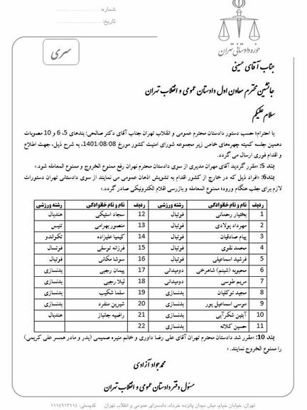 در این نامه همچنین دستور داده شده که پدر و مادر همسر علی کریمی، فوتبالیست پیشین تیم ملی ایران، ممنوعالخروج شوند.