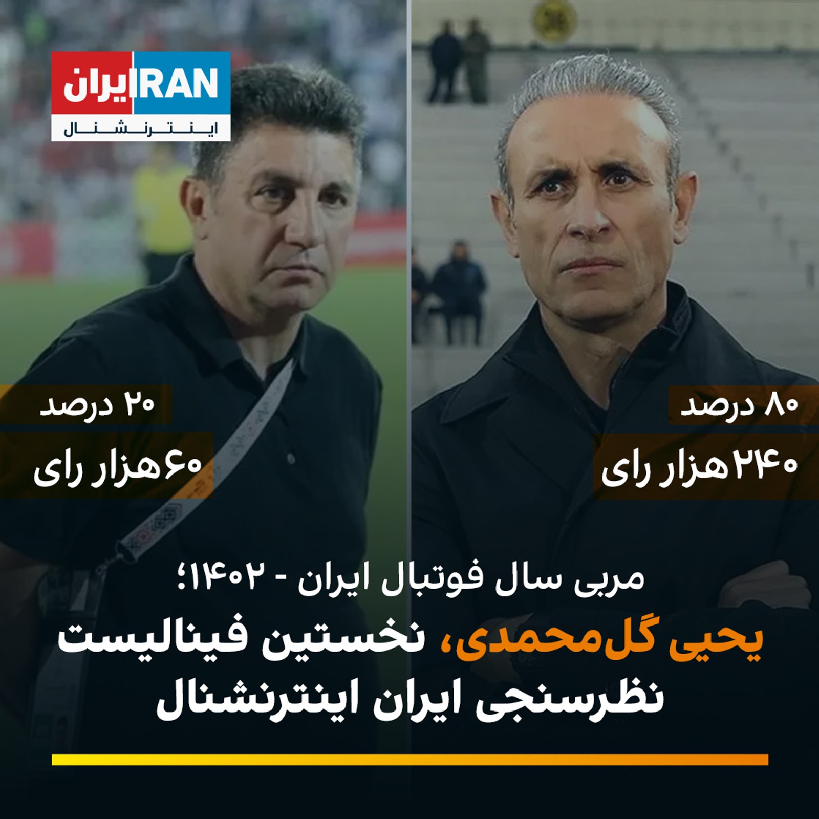 یحیی گل‌محمدی، سرمربی پیشین پرسپولیس و قهرمان سه‌گانه فوتبال ایران در فصل گذشته، با رای مخاطبان ایران اینترنشنال در رقابت با امیر قلعه‌نویی، سرمربی تیم ملی به عنوان نخستین فینالیست نظرسنجی مربی سال ۱۴۰۲ ایران شناخته شد.
