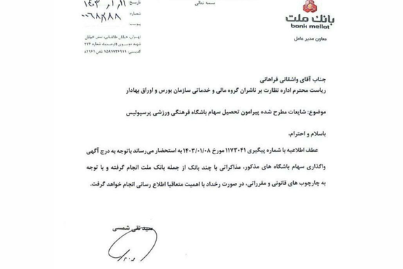 بانک ملت با انتشار نامه‌ای روی سامانه کدال خطاب به سازمان بورس و اوراق بهادار، تایید کرده با این بانک مذاکرات جهت واگذاری سهام پرسپولیس انجام شده است. این نامه در پاسخ به ابهاماتی درباره تمایل بانک ملت به مالکیت پرسپولیس منتشر شده است.