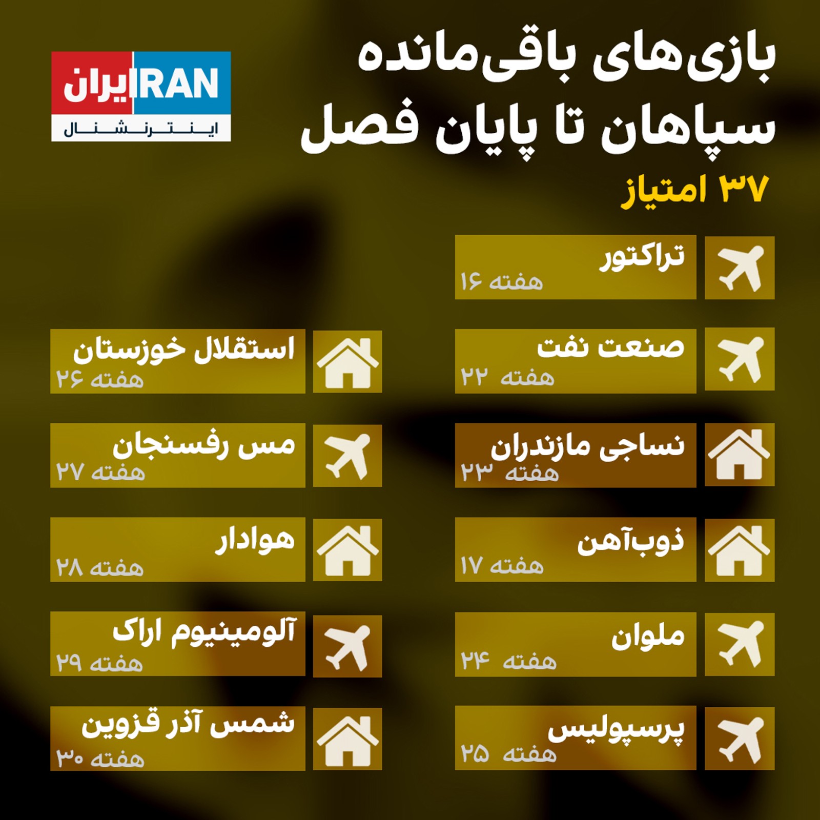 سپاهان هم بعد از بازی برابر تراکتور، به ترتیب با صنعت نفت، نساجی، ذوبآهن، ملوان، پرسپولیس، استقلال خوزستان، هوادار، آلومینیوم اراک و شمسآذر قزوین روبرو خواهد شد.