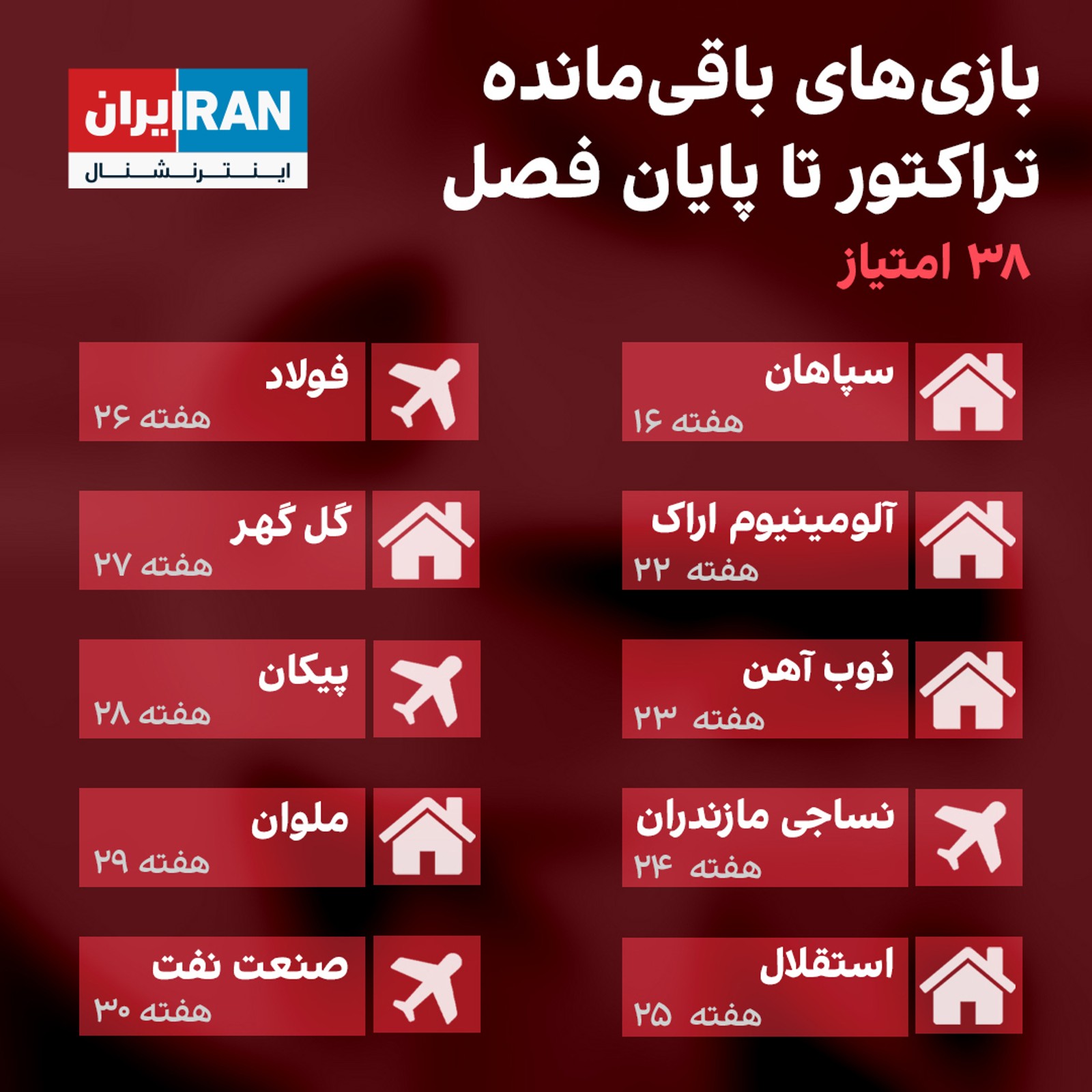 تراکتور ردهی سومی بعد از دیدار عقبافتاده با سپاهان، تیمهای آلومینیوم اراک، ذوبآهن، نساجی، استقلال، فولاد، گلگهر، پیکان، ملوان و صنعت نفت را پیش رو دارد.