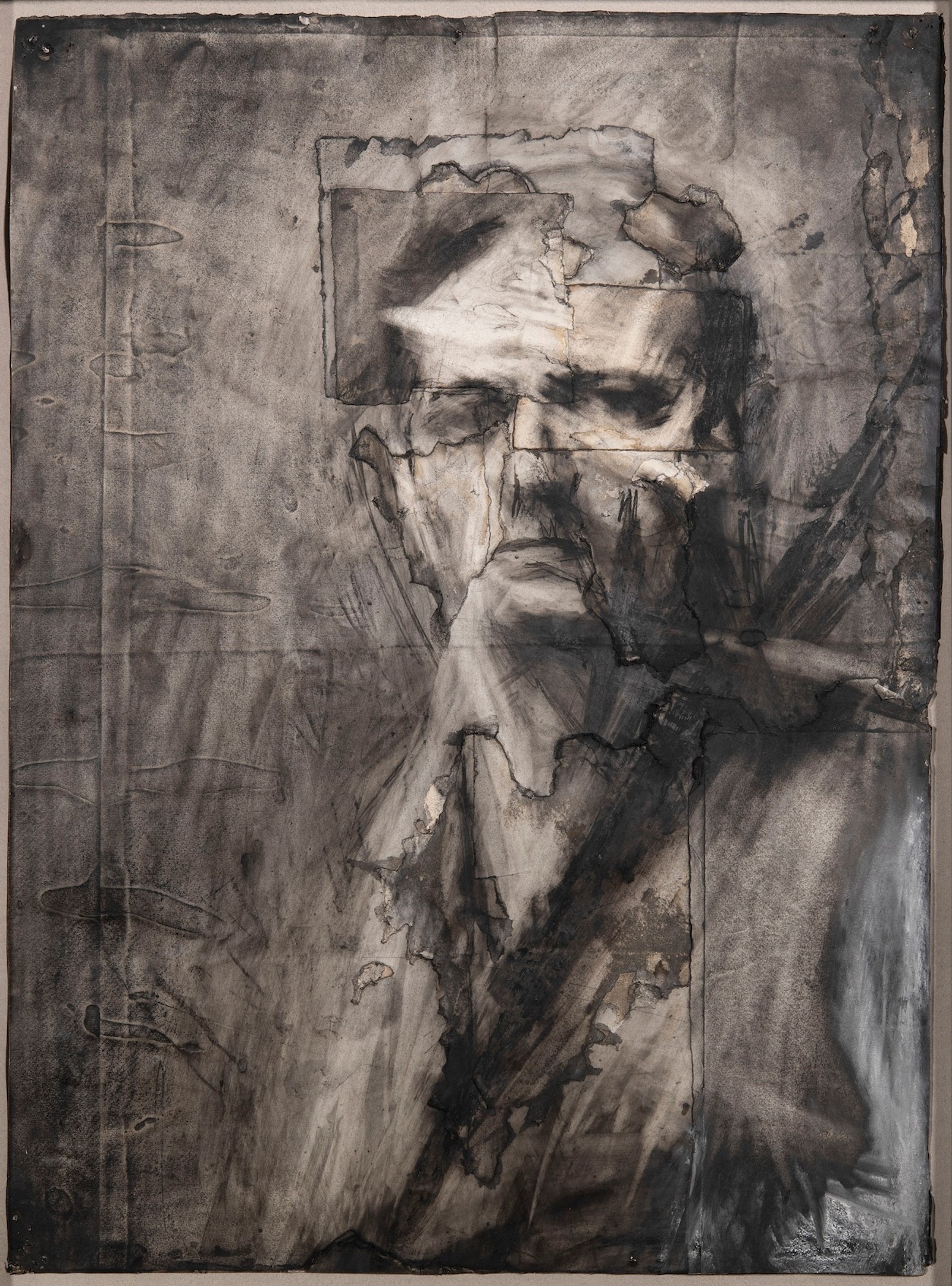 در یکی از اولین آثار این نمایشگاه که «سر لئون کوسوف» نام دارد و در سال ۱۹۵۴ خلق شده، اوئرباخ سر دوست نقاشش را به شکل غریبی برجسته می‌کند. این طراحی که پس از چند نقاشی سیاه و سفید از همین سوژه خلق شده، سر کوسوف را به شکلی انتزاعی ترسیم می‌کند که در آن با مرگ پیوند می‌خورد. در طراحی دیگری با همین عنوان که دو سال بعد خلق شده، اوئرباخ بیشتر بر نور و سایه تأکید می‌کند و به ترکیب متفاوتی می‌رسد.