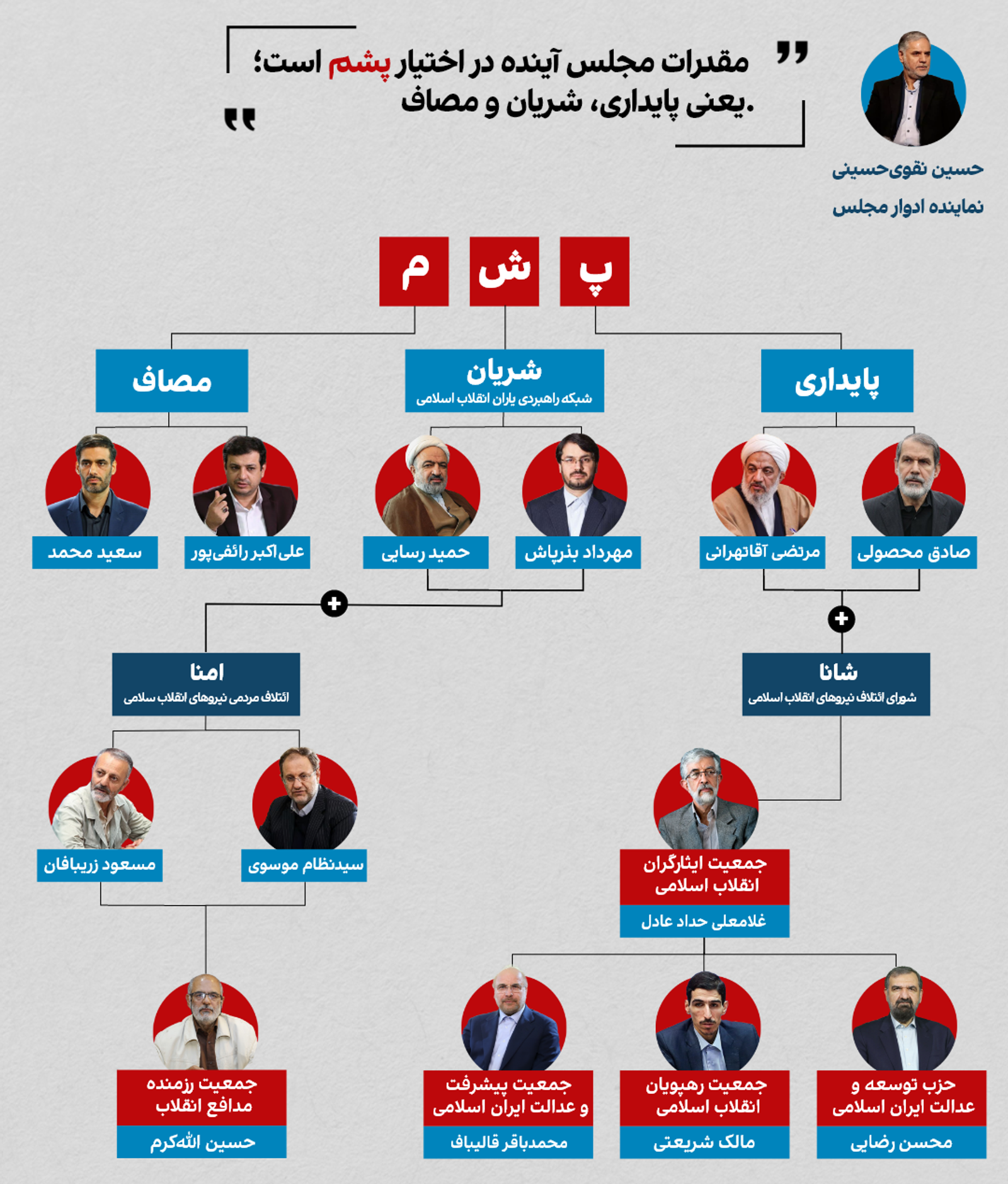 در روزهای پایانی فروردین‌ماه ۱۴۰۳، حسین نقوی‌حسینی، نماینده ادوار مجلس، درباره ترکیب مجلس دوازدهم گفت: «از نگاه بنده مقدرات مجلس آینده در اختیار پشم است یعنی پایداری، شریان و مصاف که این اصطلاح، توضیح مختصر و مفید این سه کلمه است.»