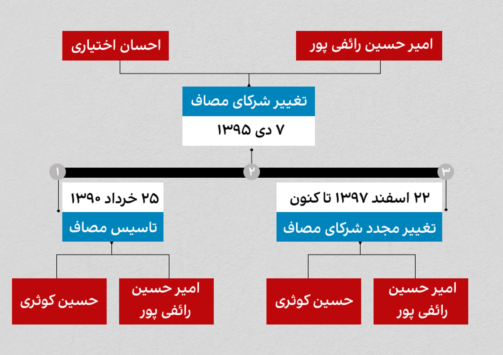 در دی ماه ۱۳۹۵، حسین کوثری با دریافت حق الشرکه‌اش از موسسه خارج و کمی بعد فردی به نام احسان اختیاری جایگزین شد. دوباره در اسفند ۱۳۹۷، حسین کوثری شریک و احسان اختیاری خارج شد. این شرح مختصری از وضعیت مصاف است.