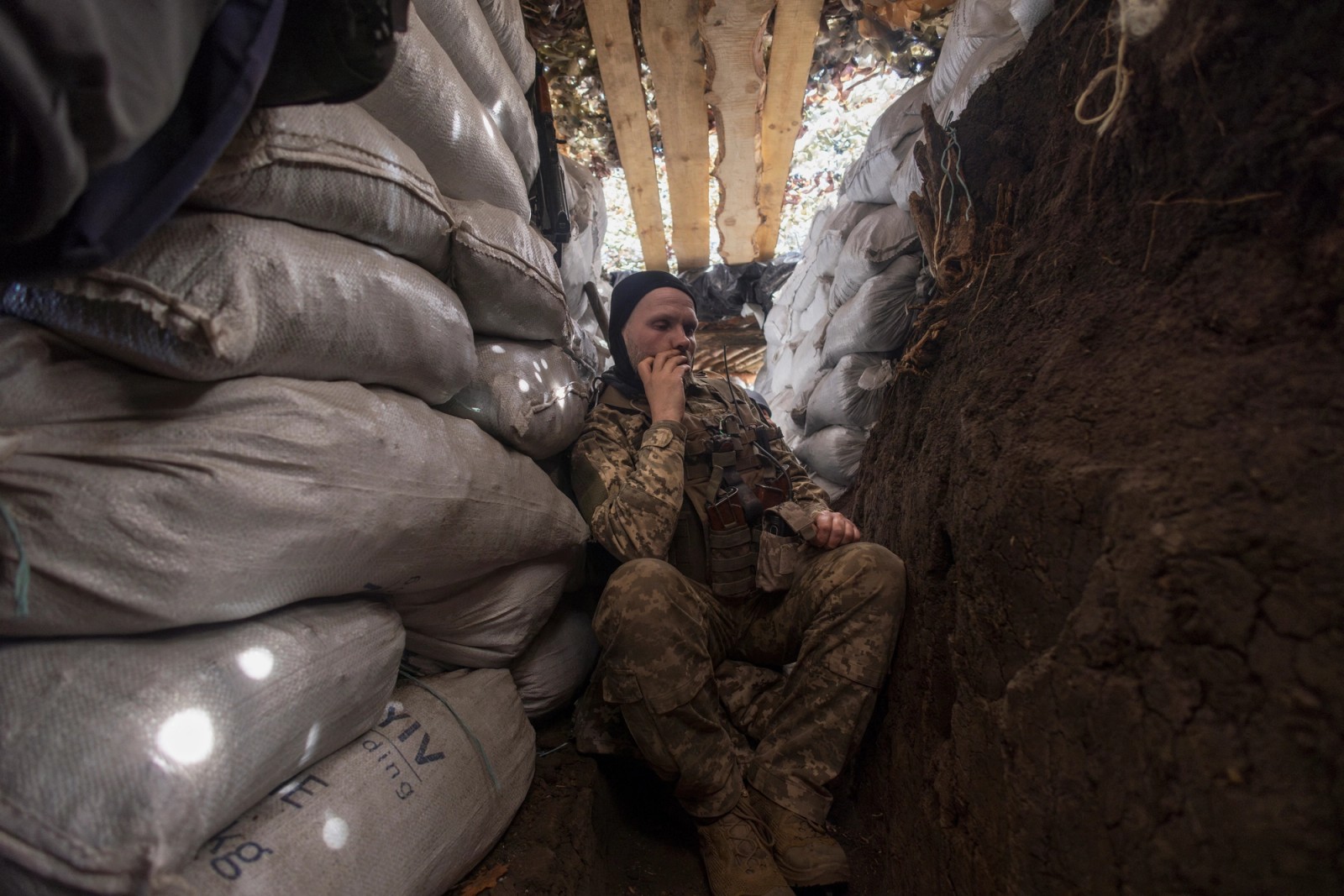 یک سرباز اوکراینی در خط مقدم نبرد با روسیه، دونتسک اوکراین، ۲۵ فروردین