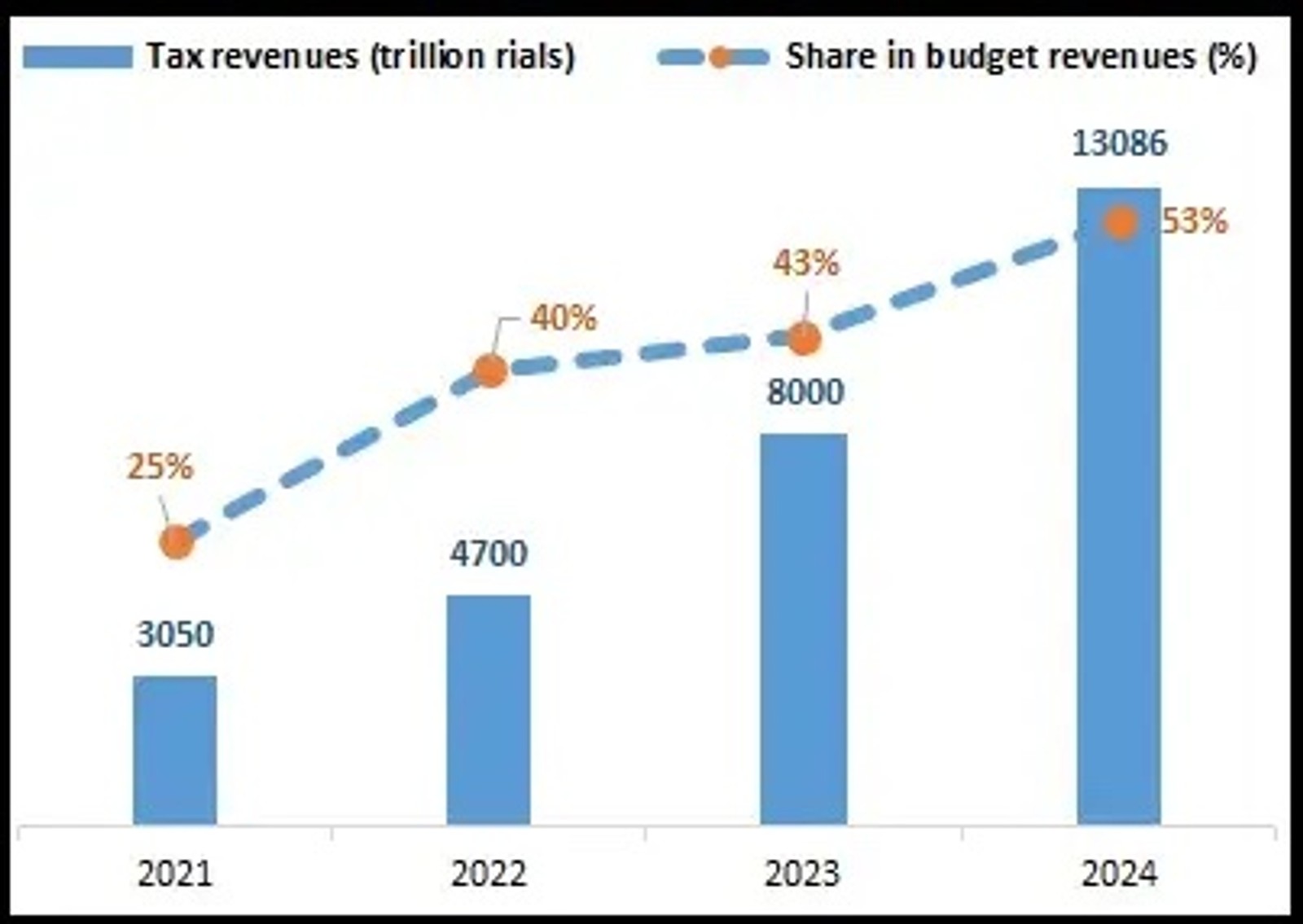 در نمودار زیر ستون‌های آبی رنگ، نشان‌گر درآمدهای مالیاتی به تریلیون‌ ریال و خطوط منقطع نشان‌دهنده سهم از درآمدهای بودجه است