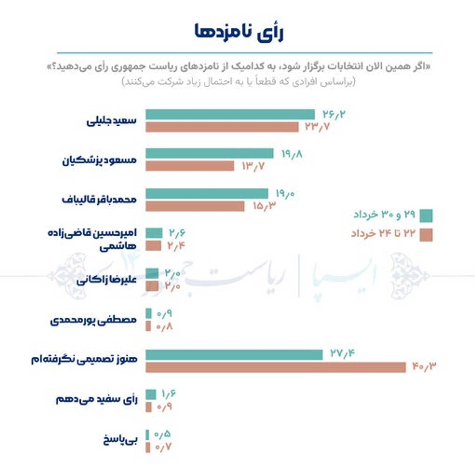 از میان افرادی که مشارکتشان را در انتخابات قطعی اعلام کردند، ۲۶/۲ درصدشان گفته‌اند به جلیلی، ۱۹/۸ درصد اعلام کرده‌اند به پزشکیان و ۱۹ درصد گفته‌اند به قالیباف رای می‌دهند.