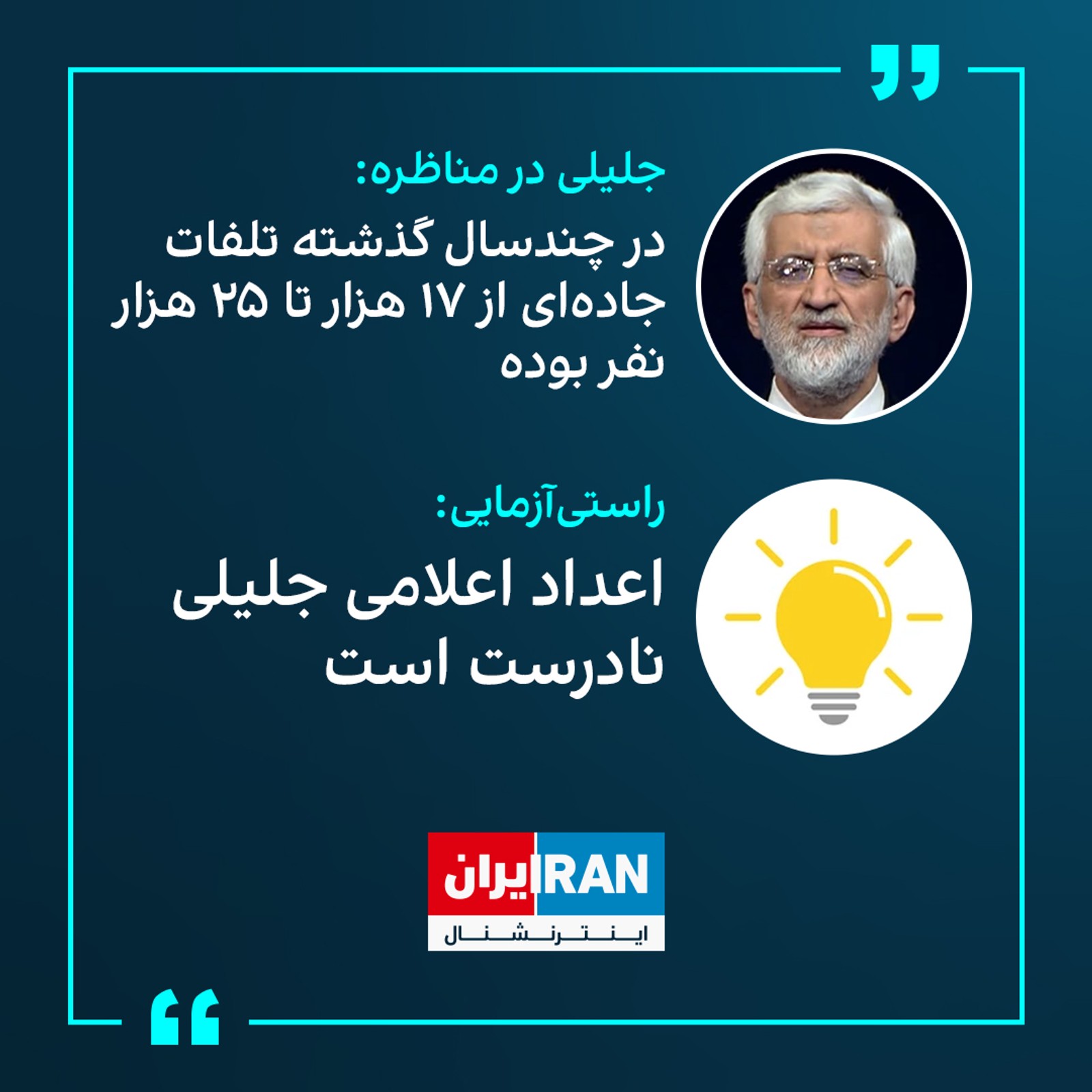 سعید جلیلی در جریان دومین مناظره نامزدهای مورد تایید شورای نگهبان برای جانشینی رئیسی گفت: «در چند سال گذشته تلفات جادهای ما از ۱۷ هزارتا بوده تا ۲۵ هزارتا، متوسطش میشود ۲۰ هزار نفر.»