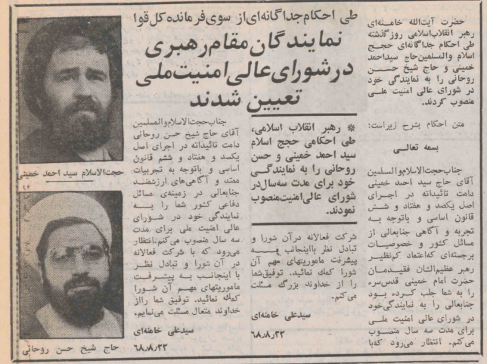 از طرفی، هرچند رییس شورا طبق قانون رییسجمهور است، دبیران شورای عالی امنیت ملی از بدو تاسیس تاکنون همواره نماینده منصوب خامنهای در این شورا بودند.