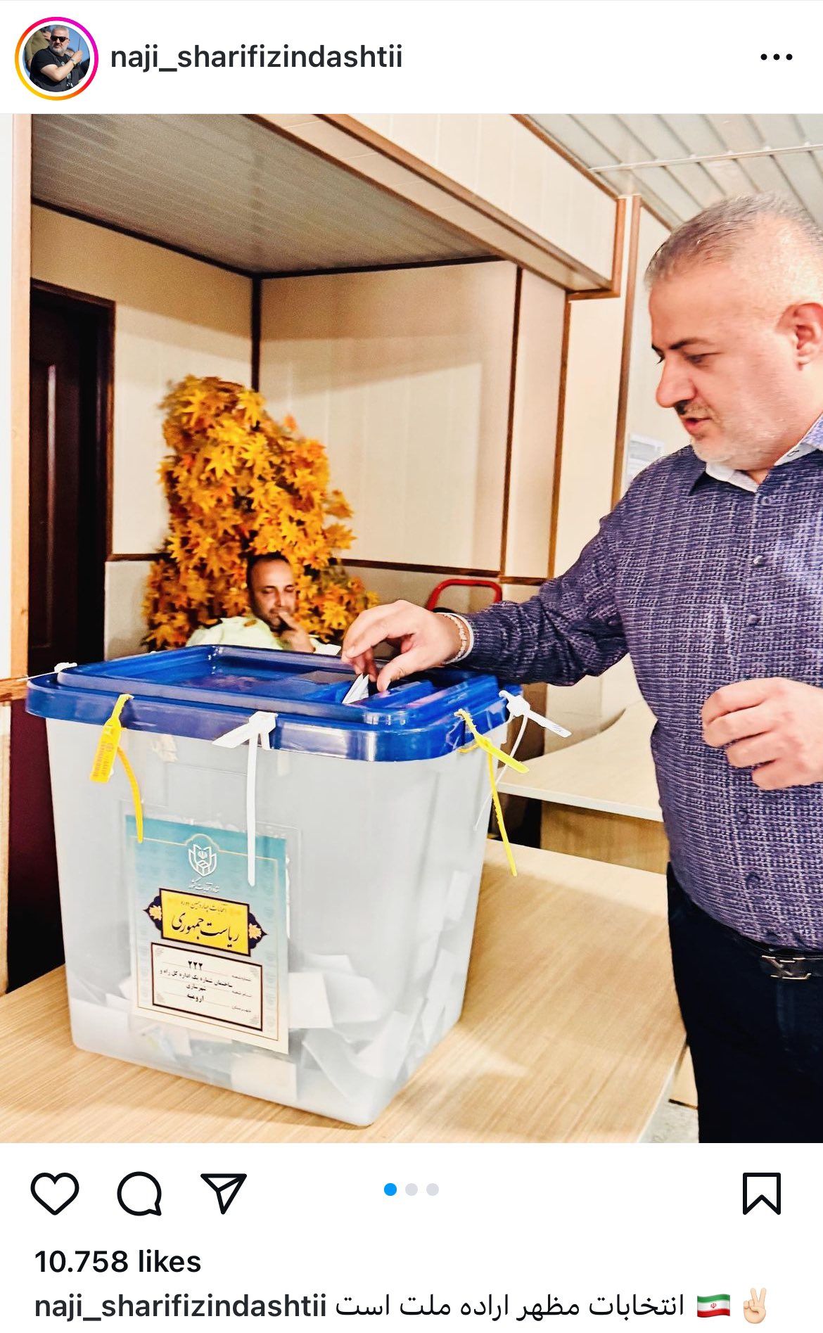 ناجی شریفی زیندشتی، کارتل آدمربایی و قاچاق مواد مخدر که سالها در خارج از ایران، با وزارت اطلاعات و سپاه پاسداران در زمینههای ترور و ربودن مخالفان حکومت و قاچاق مواد مخدر به اروپا همکاری کرده، با انتشار تصویر خود در حال رای دادن در انتخابات، نوشت: «انتخابات مظهر اراده ملت است.»