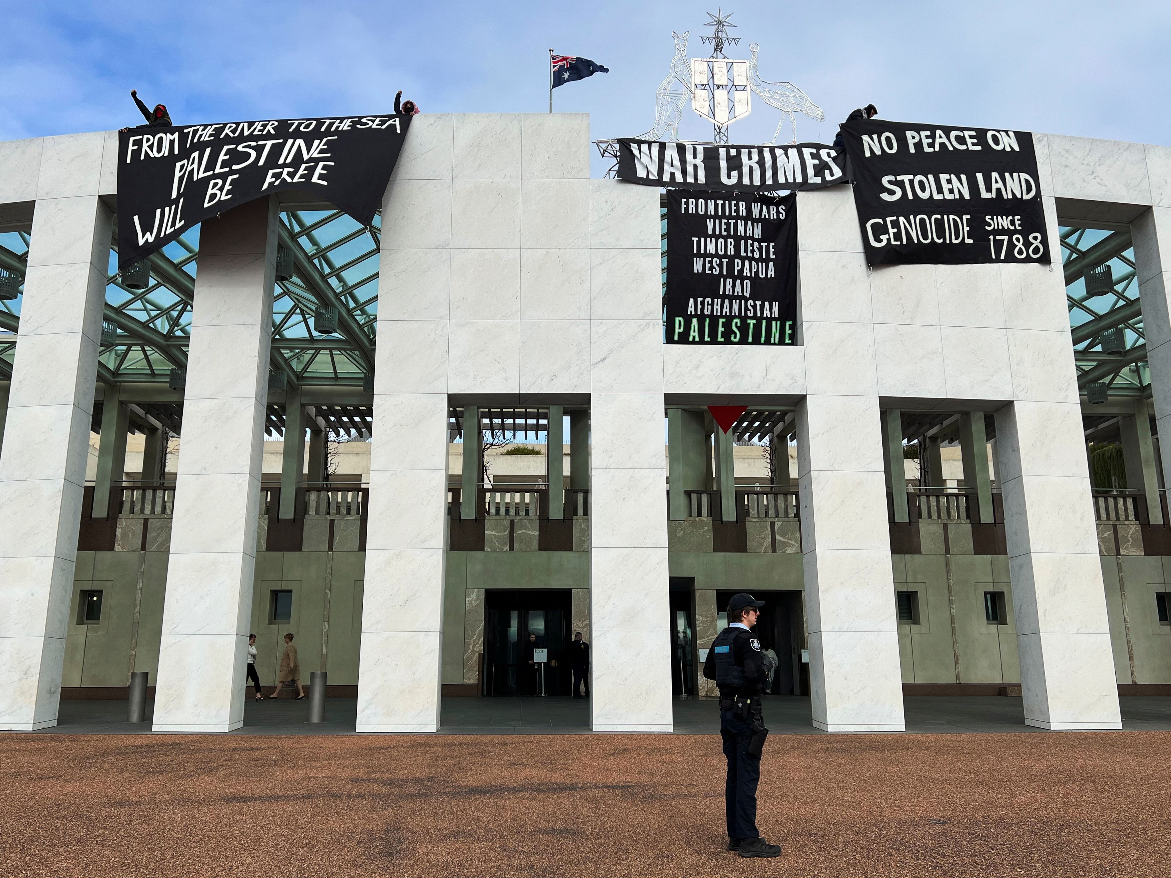 معترضان طرفدار فلسطین روز پنجشنبه ۱۴ تیر از پشتبام ساختمان پارلمان استرالیا در شهر کانبرا بالا رفتند و پارچهنوشتی را که روی آن شعار «از نهر تا بحر، فلسطین آزاد خواهد شد»، آویزان کردند و اسرائیل را به «جنایات جنگی» متهم کردند.