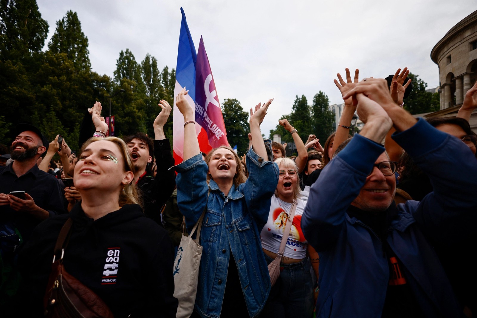 خوشحالی طرفداران ائتلاف احزاب چپ‌گرای «جبهه مردمی جدید» پس از پیشتازی غیرمنتظره این ائتلاف در انتخابات پارلمانی فرانسه، پاریس، ۱۷ تیر