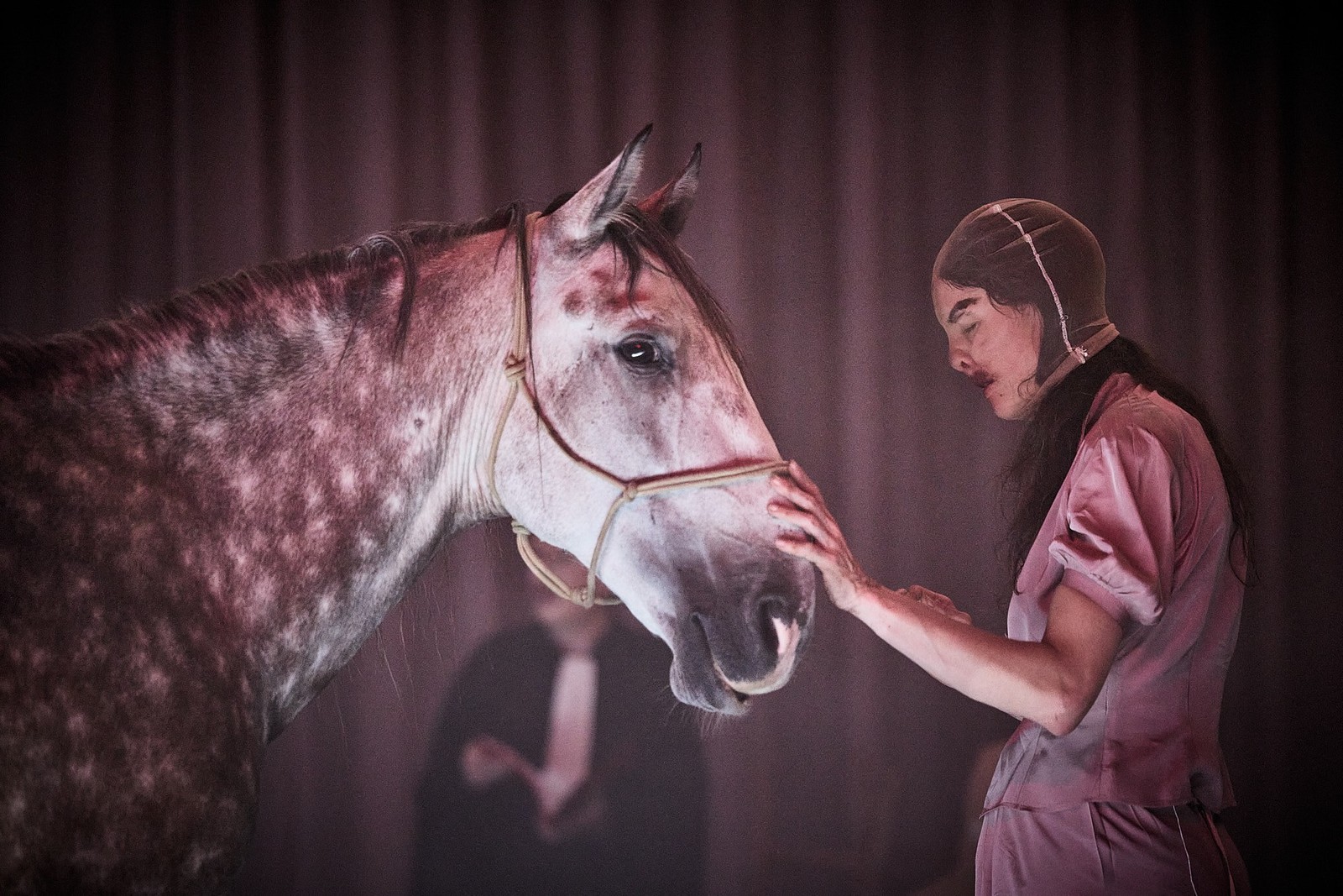 این فضای شبه سوررئال با ورود یک اسب تکاندهنده میشود: یک اسب واقعی قهوهای-سفید بزرگ بدون راهنما وارد صحنه میشود و تا نزدیک به انتها روی صحنه میماند. اسب به طرز عجیبی به بازیگر نمایش بدل میشود: در گوشههای مختلف صحنه راه میرود و بیآن که کسی هدایتش کند، با ساختار و محتوای صحنه هماهنگ میشود. او هم گویی به بیعدالتیهای بشر اعتراض دارد و با نگاهی عاقل اندر سفیه، به شخصیتهای نمایش چشم میدوزد. در صحنهای حیرتانگیز- که مشخص نیست در نمایشنامه آمده یا اتفاقی رخ میدهد- اسب به جلوی میز قاضی میرود و کتاب قانون را با دهانش برمیدارد، آن را میجود و به گوشهای پرت میکند. از بین شخصیتهای روی صحنه اسب زنی را انتخاب میکند که از همه مظلومتر به نظر میرسد، در نتیجه در غالب اوقات کنار او میایستد و زن اسب را نوازش میکند.