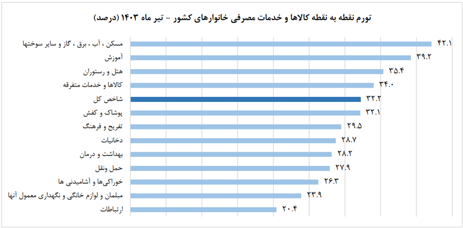 بالاترین میزان تورم به ترتیب در گروه‌های: هتل و رستوران۴۹/۷ درصد، پوشاک و کفش۴۱/۵ درصد و مسکن، آب، برق، گاز و سایر سوخت‌ها ۴۰/۳ درصد ثبت شده است.