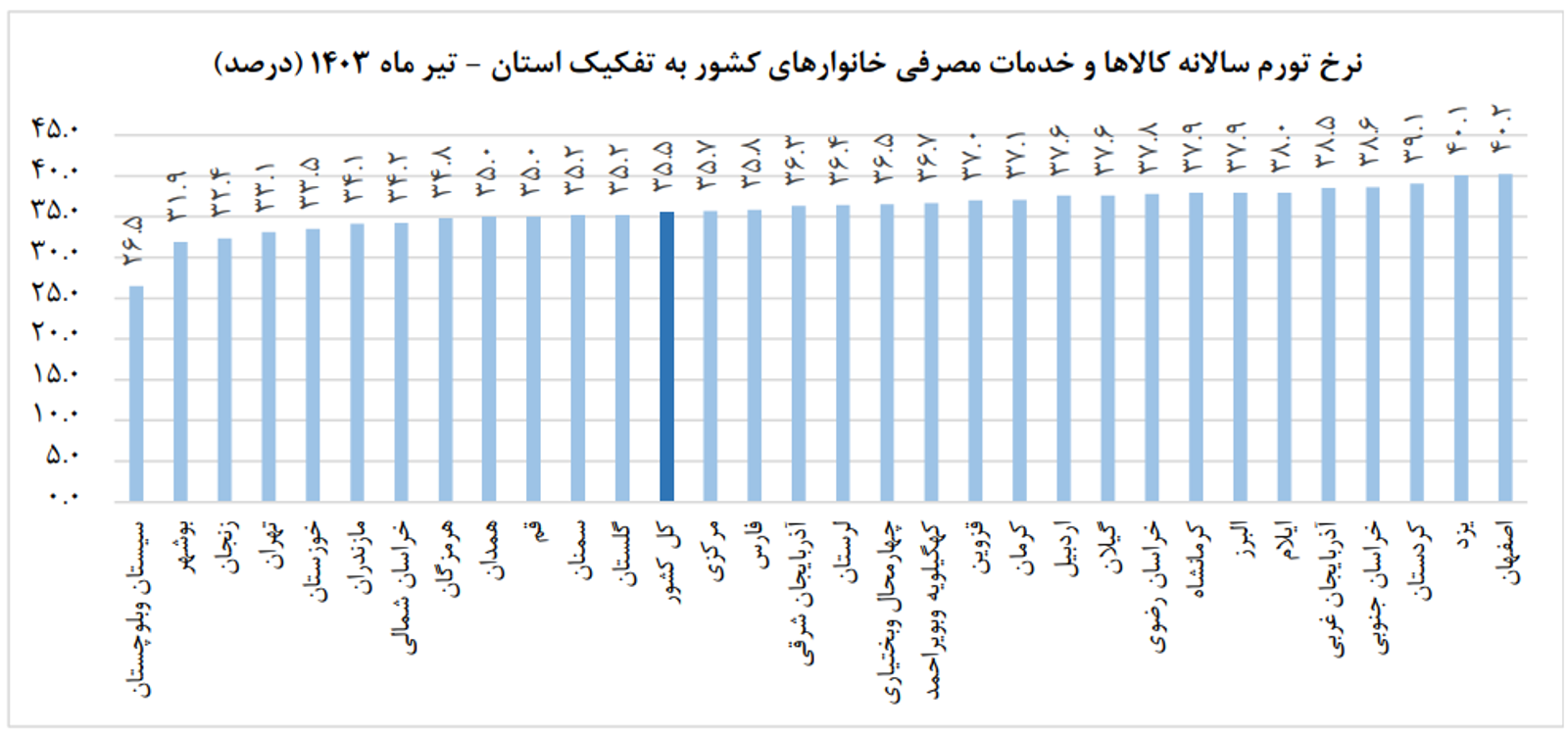 تازه ترین گزارش شاخص قیمت مصرف کننده حاکی از آن است که استان‌های اصفهان، یزد و کردستان بالاترین نرخ تورم را در تیر ماه ۱۴۰۳ تجربه کردند.