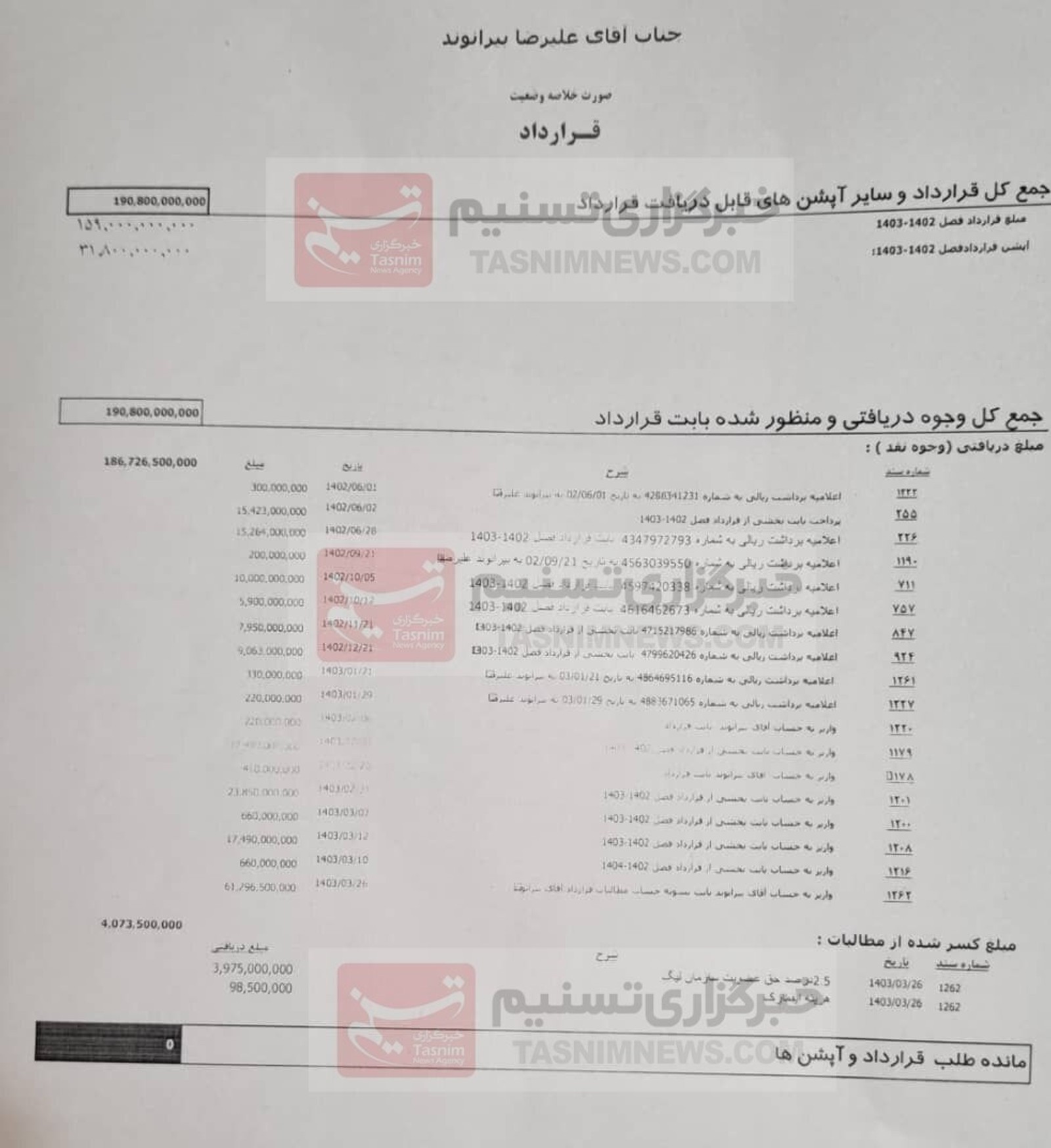 مطابق اسنادی که تسنیم از پرداختی‌های باشگاه پرسپولیس به علیرضا بیرانوند منتشر کرده، «پرسپولیس در ۱۱ مورد از ۲ شهریور ۱۴۰۲ تا ۲۶ خرداد ۱۴۰۳، مبلغ ۱۹ میلیارد و ۸۰ میلیون تومان به حساب این بازیکن واریز کرده». این درحالی است که درویش مدعی بود قرارداد بیرانوند، ۱۵میلیارد تومان است.